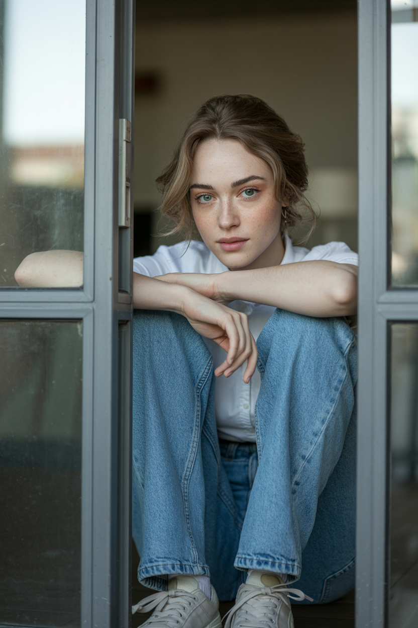 Женщина в светло-голубых джинсах с завышенной талией и минималистичном светло-бежевом свитшоте свободного кроя с длинными рукавами. На ногах кремовые кеды. Она сидит на покрытой тканью скамье у окна студии, обхватив колени руками и закинув голову назад, уверенно смотрит прямо в камеру. Светлый...