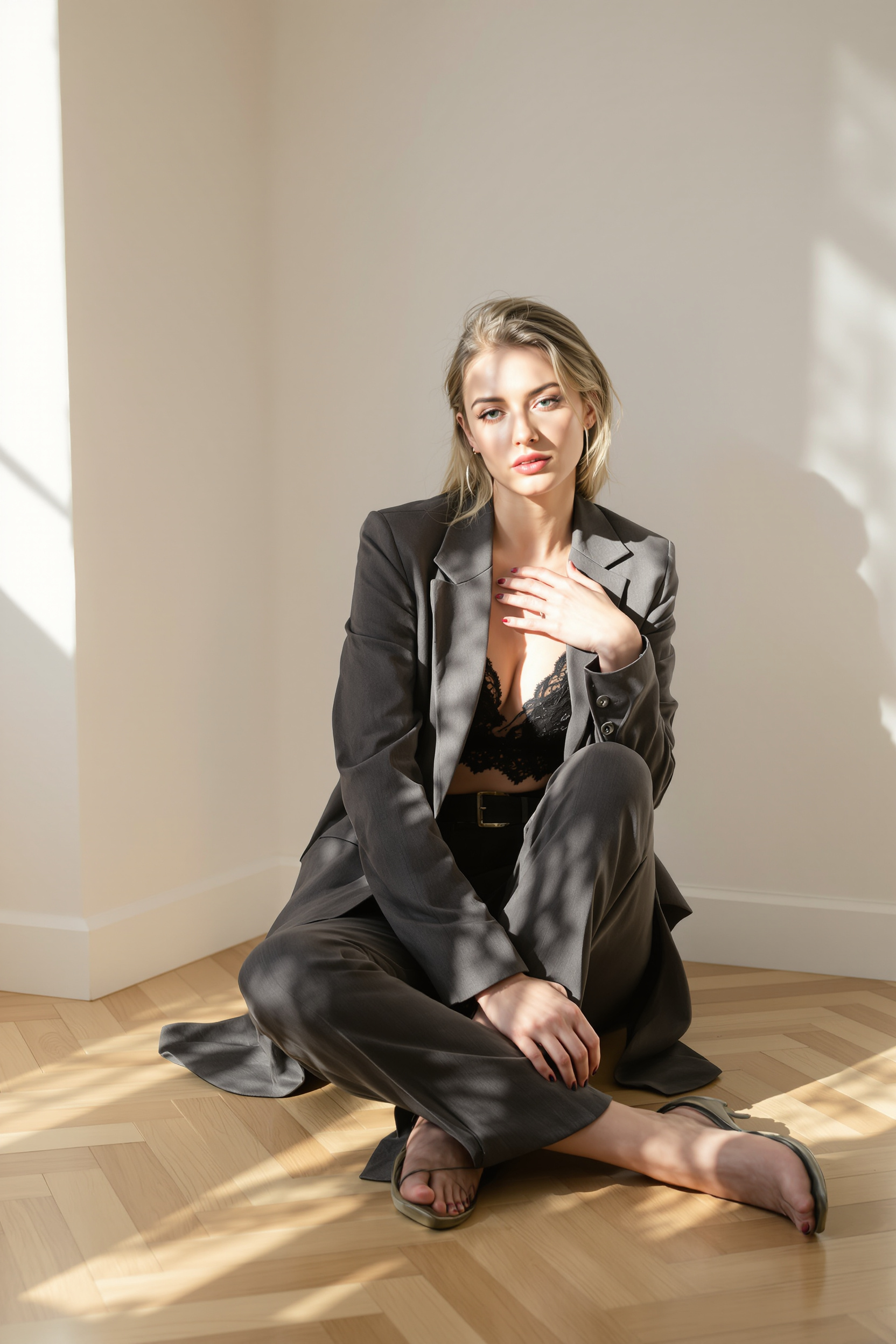 Женщина в классическом графитовом пиджаке и кружевном черном топе сидит на полу, обняв колени, чуть повернувшись грудью к камере. Естественный свет создает солнечные пятна на светлом паркете, минималистичная студия, натуральный макияж.
