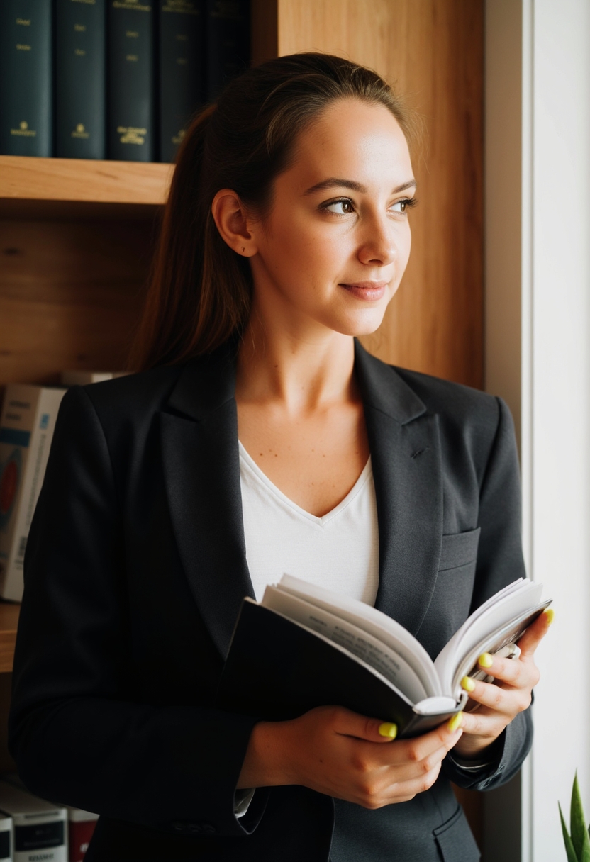 Женщина в классическом костюме стоит у окна кабинета с книгой в руках. Она смотрит в сторону, на лице — задумчивое выражение. Позади — книжные полки и мягкий дневной свет. Крупный план, подчёркивающий внутреннюю сосредоточенность.