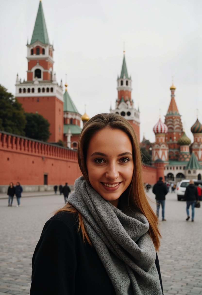 Женщина в ярком шарфе и пальто стоит у исторического музея, смотрит прямо в камеру, вокруг золотые купола