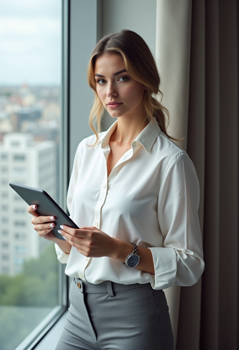 Женщина в классической белой блузке и серых брюках стоит у окна с планшетом в руках, её взгляд направлен в объектив, поза спокойная и профессиональная. На фоне — городские виды. Крупный план.