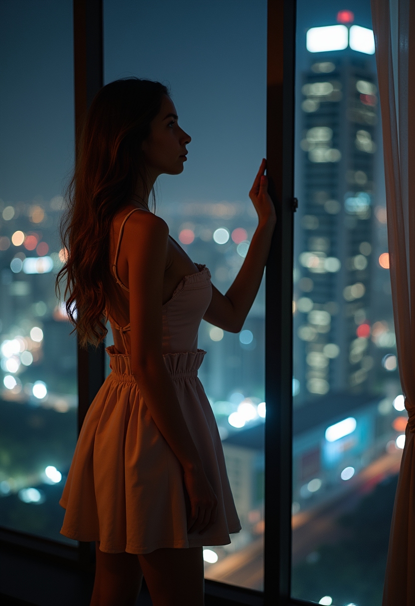 Женщина в коротком платье с глубоким декольте стоит у большого окна с видом на ночной город, её рука слегка касается стекла, создавая романтичную атмосферу.