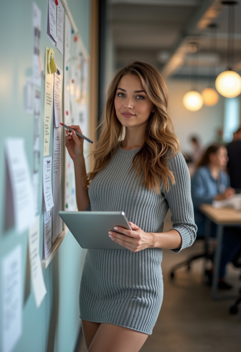 Женщина в коротком трикотажном платье и кедах стоит у доски с заметками, держа в руках маркеры и планшет. Она слегка опирается на стол, взгляд направлен в камеру, позади офисная суета. Крупный план.