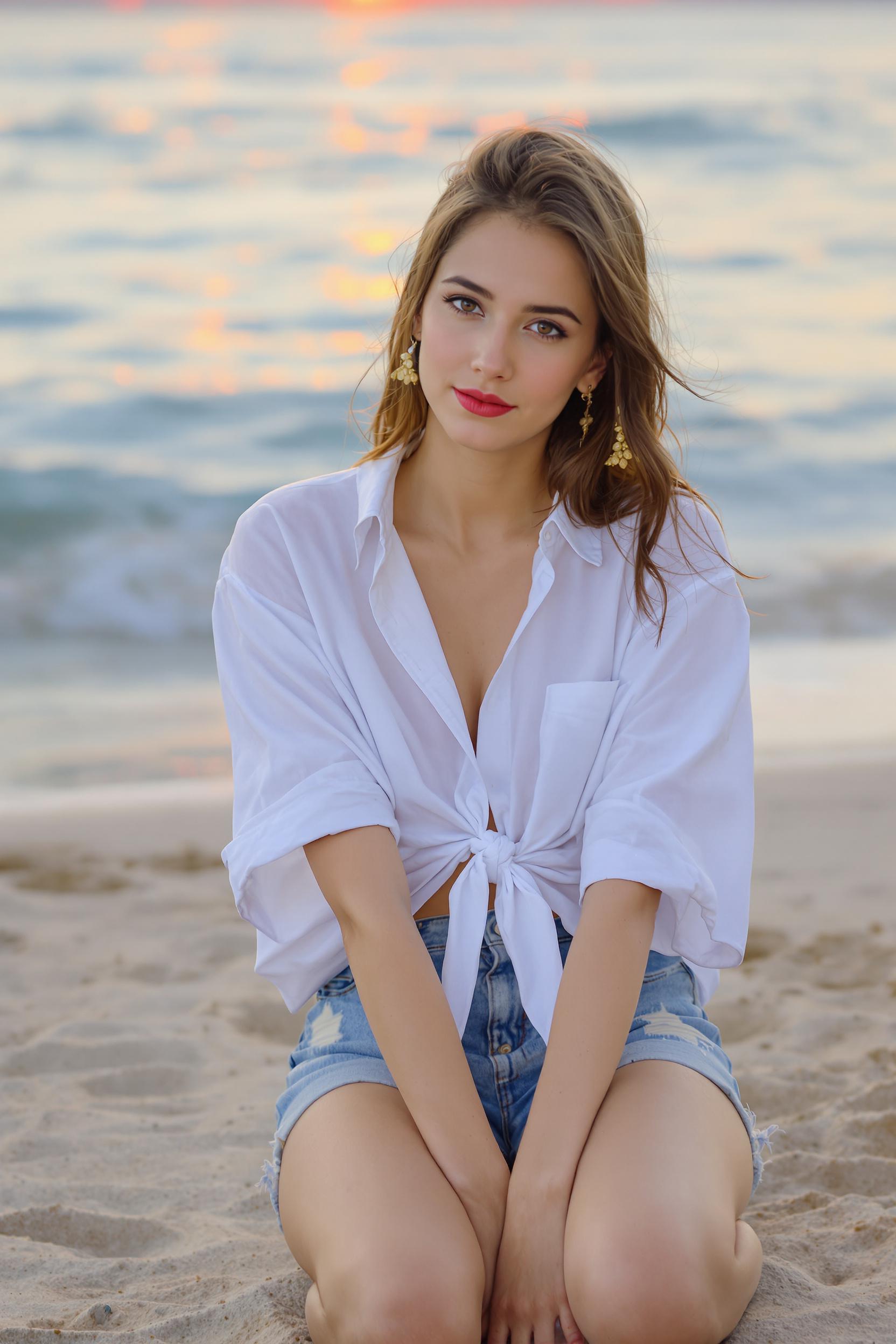Женщина в короткой белой рубашке на завязках и свободных джинсовых шортах сидит на песке у самой воды, руки обнимают колени, босые ноги вытянуты вперёд. Яркий багряный закат отражается на её одежде, она уверенно смотрит в объектив камеры.