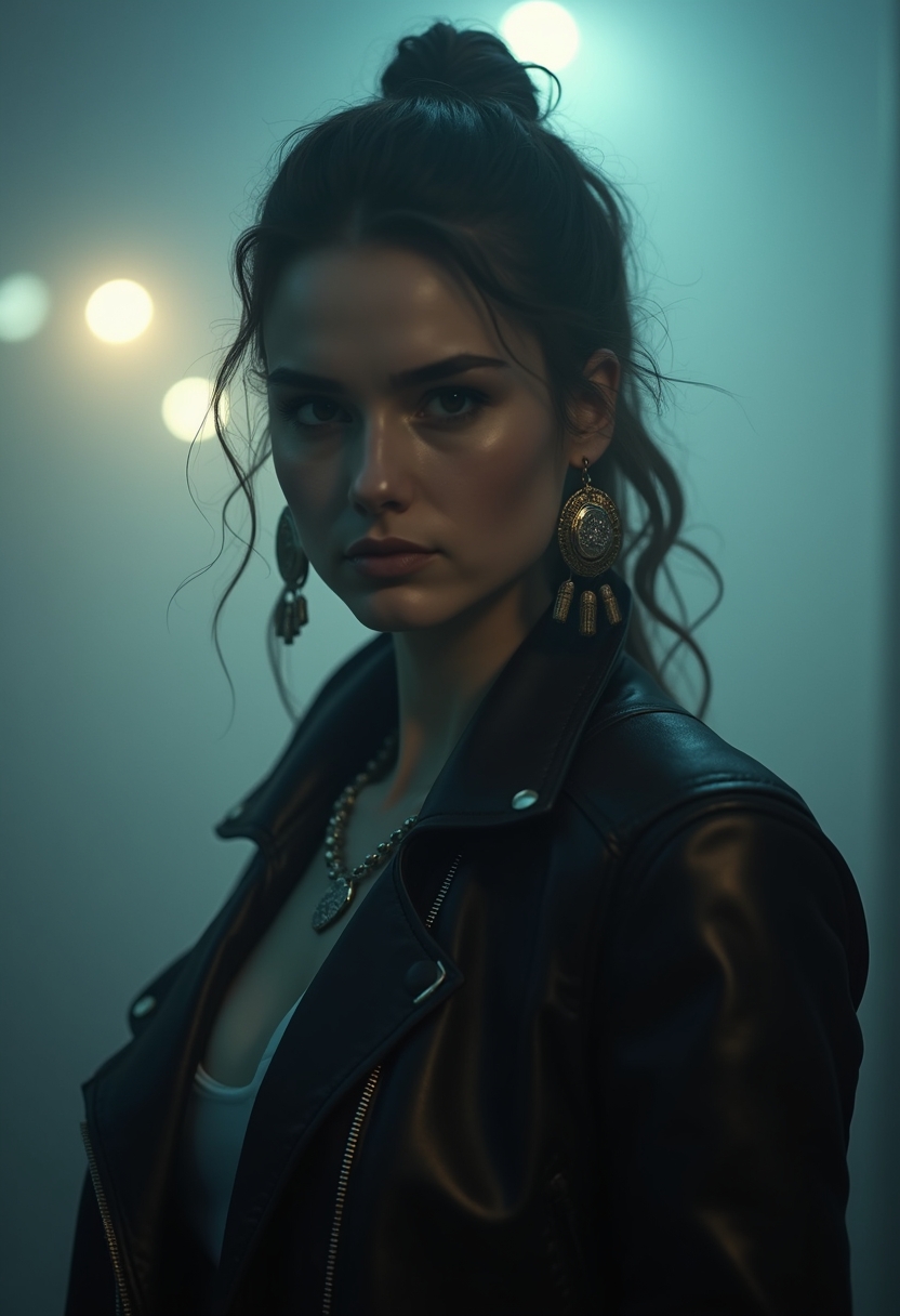 Женщина в кожаной куртке и массивных серьгах стоит в тумане, сквозь который просвечивают слабые огни. Её лицо крупным планом, взгляд направлен прямо в камеру, выражение лица дерзкое. Освещение мягкое, акцент на её силуэте.