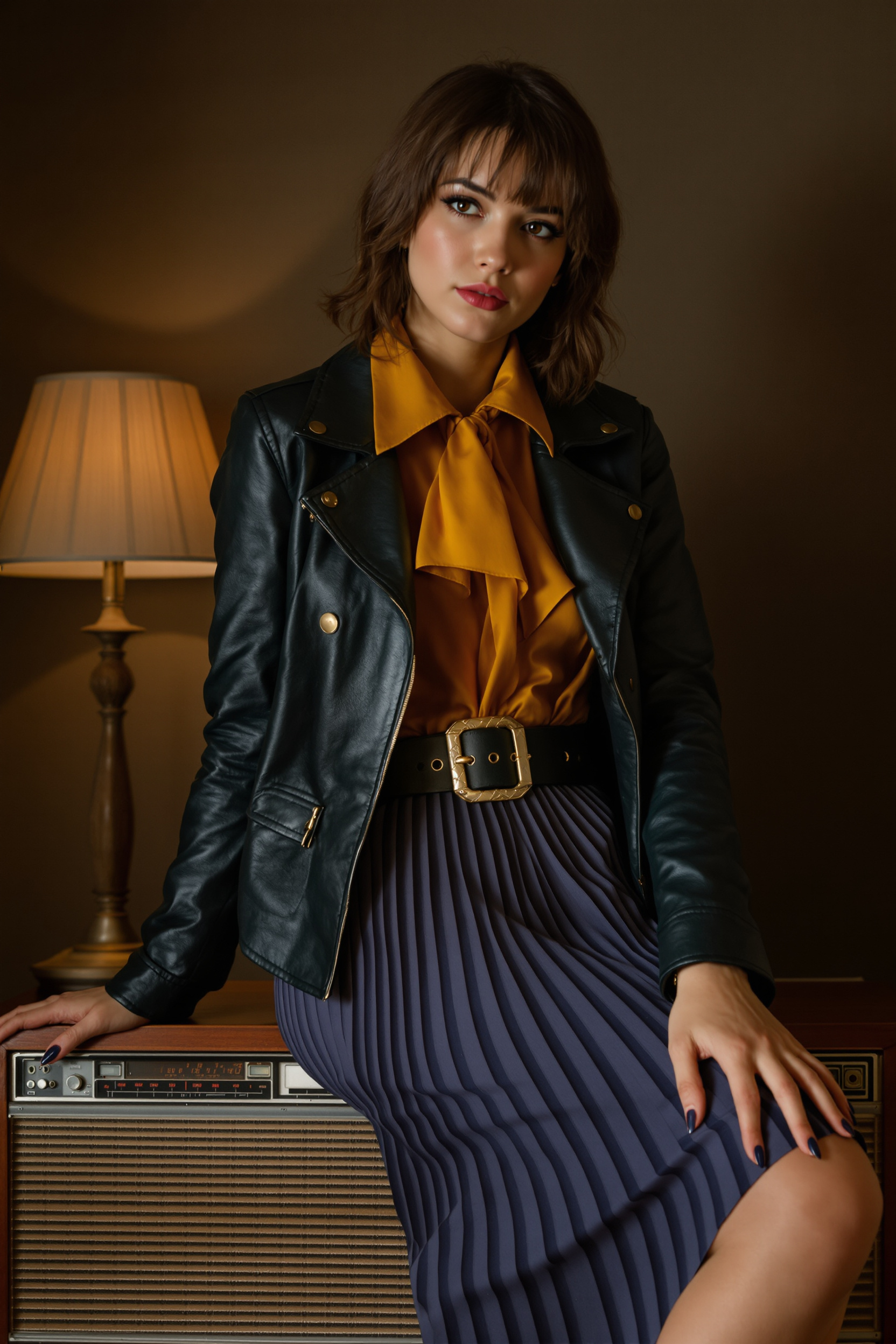 Женщина в кожаной куртке и плиссированной юбке миди, яркая блузка с большим воротником и ремень с крупной пряжкой, сидит на старом деревянном радиоприёмнике, средний план, поза с одной рукой на колене, пристальный взгляд в камеру, теплый ламповый свет.