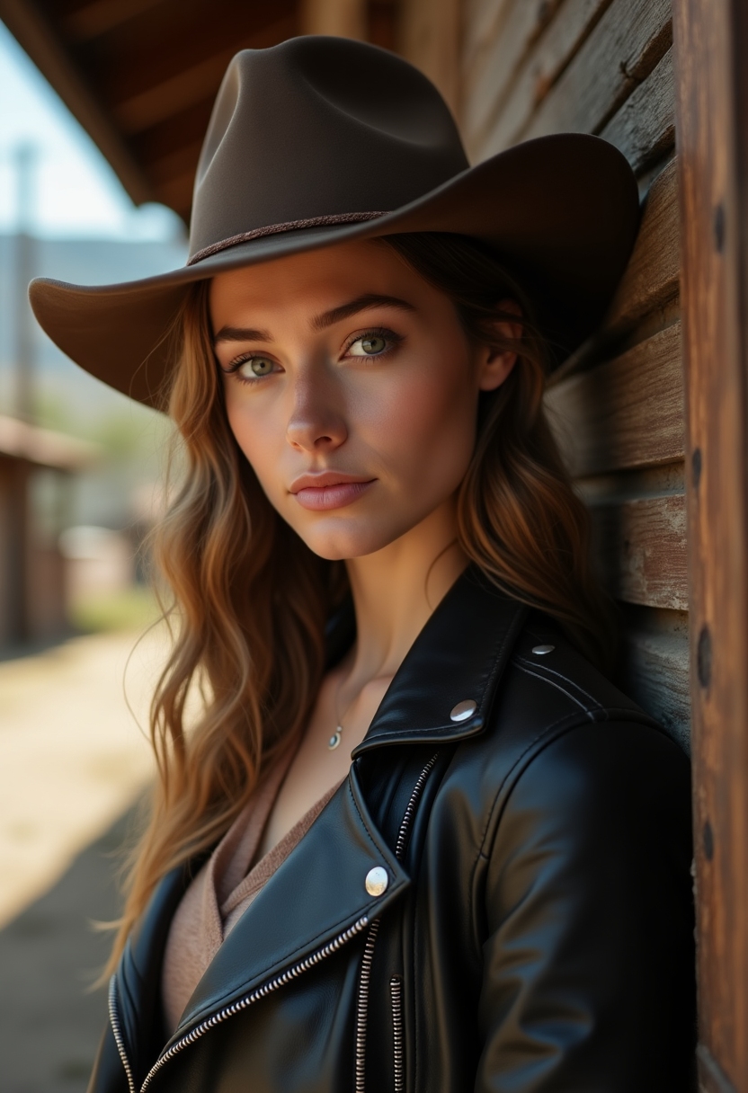 Женщина в кожаной куртке и шляпе стоит на фоне деревянного салуна, смотрит прямо в камеру, позади пыльная улица