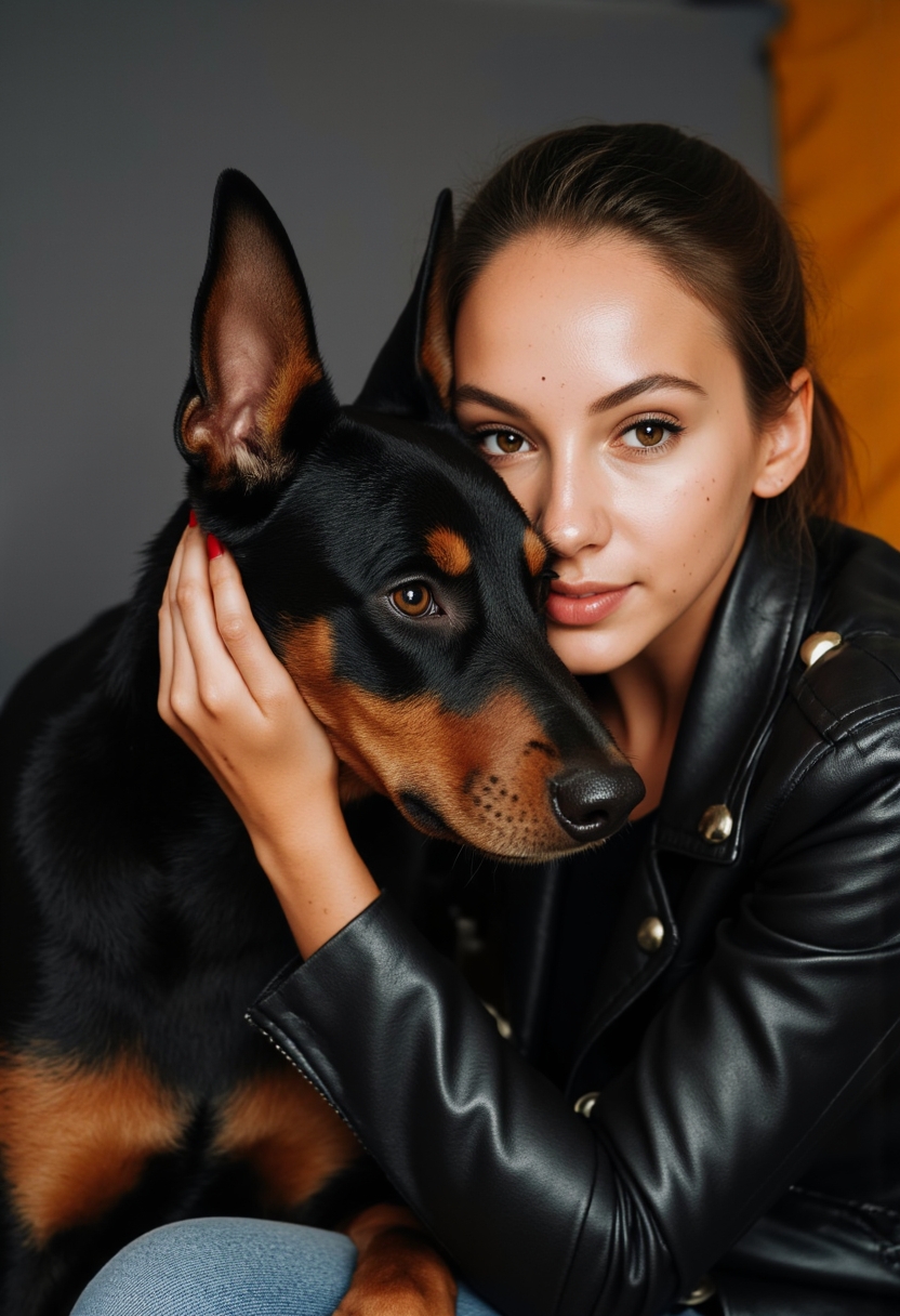Женщина в кожаной куртке с заклёпками наклоняется к доберману, её лицо на уровне его морды. Её взгляд строгий, выражение лица уверенное. Доберман смотрит прямо в камеру, его острые черты подчёркнуты боковым светом. Фон размытый, акцент на их близости.