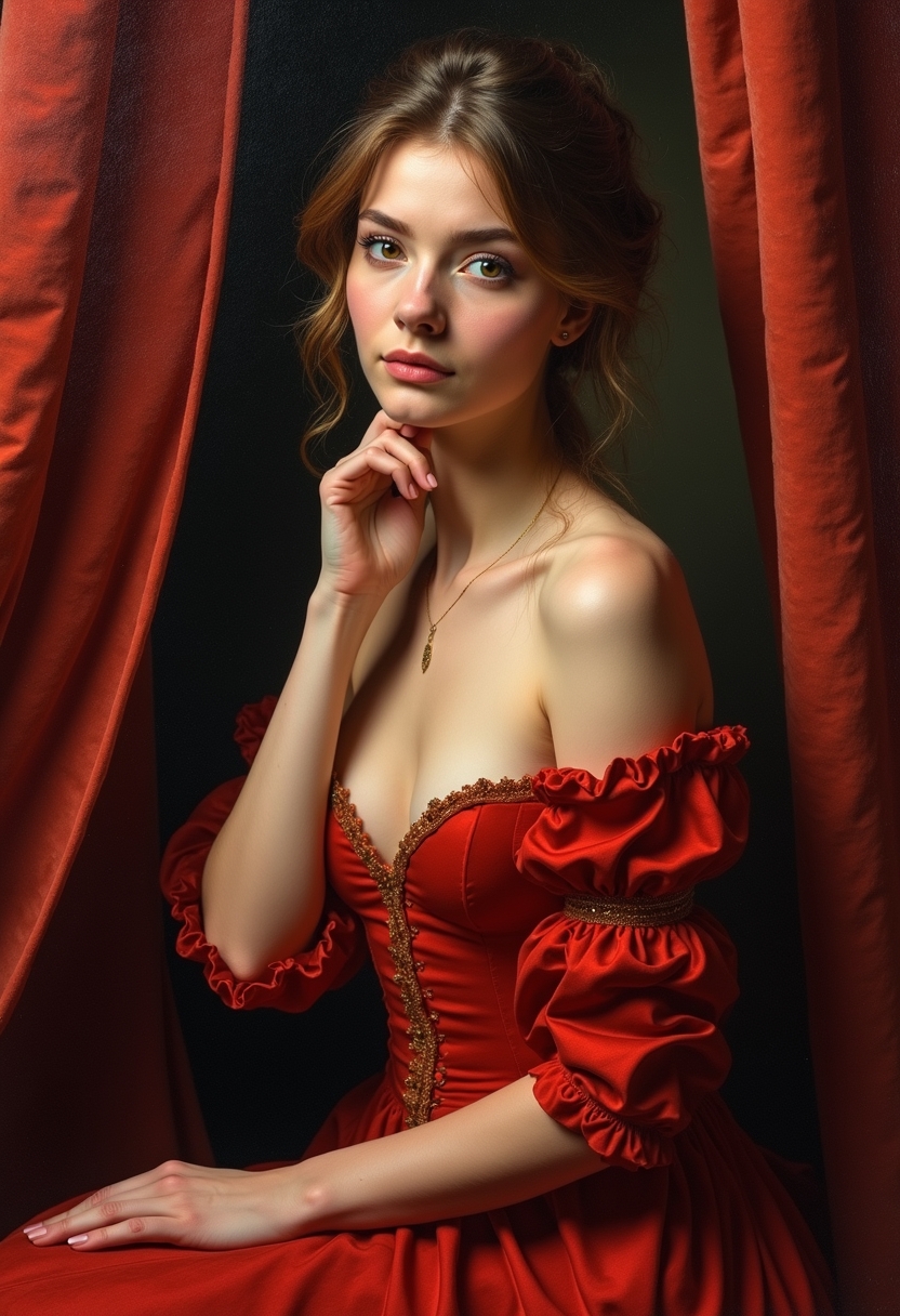 Женщина в красном платье с глубоким декольте сидит в обрамлении бархатных занавесок, её рука слегка касается шеи. Мощные мазки передают насыщенность красного цвета и тёплый свет на её коже. Позади густые тени, создающие эффект старинного портрета. Крупный план, вдохновлённый работами Веласкеса. Картина маслом