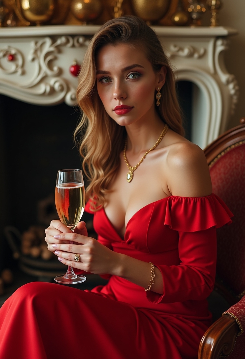 Женщина в красном платье с золотыми украшениями сидит у украшенного камина, держит бокал с шампанским, смотрит прямо в камеру