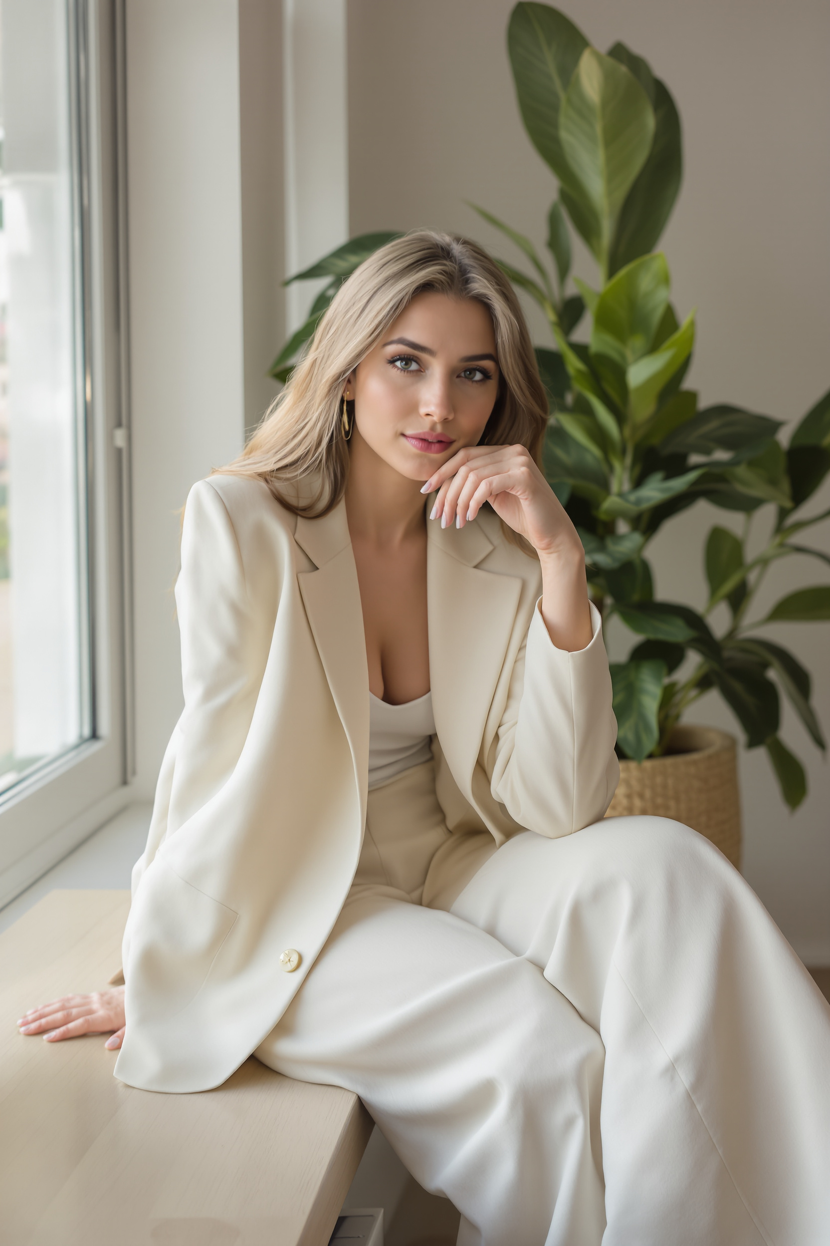 Женщина в кремовом костюмном пиджаке и светло-бежевых широких брюках полусидит на краю светлого деревянного столика, чуть подпирая щеку рукой. У окна, на фоне — минимализм и горшок с крупным зеленым растением, мягкий естественный свет.