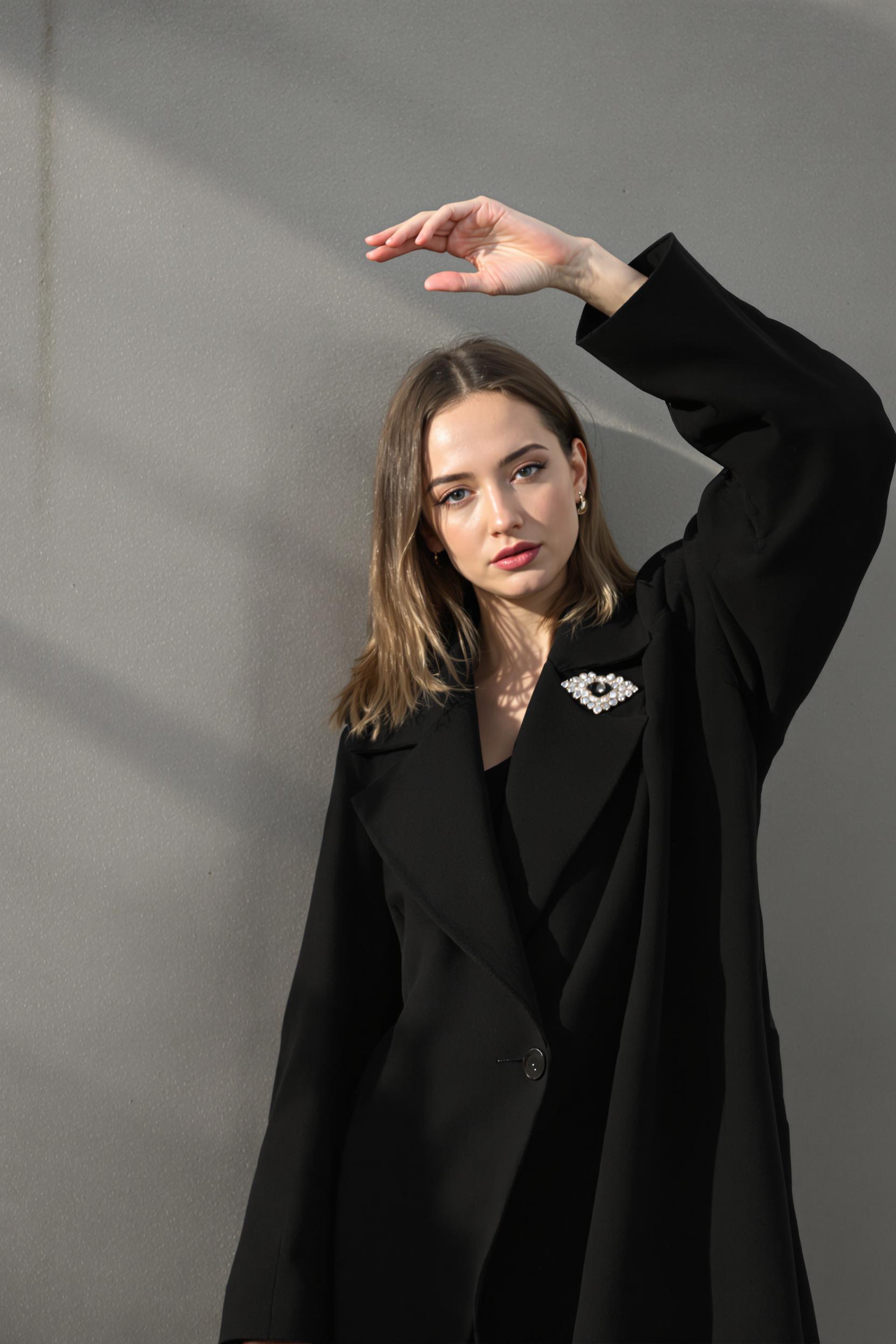 Женщина в лаконичном черном плаще оверсайз, на плечах минималистичная брошь из металла. Стоит вполоборота, одну руку поднимает над головой, пальцы сомкнуты в кольцо, смотрит прямо в камеру. Фон — бетонная стена с мягкой тенью.