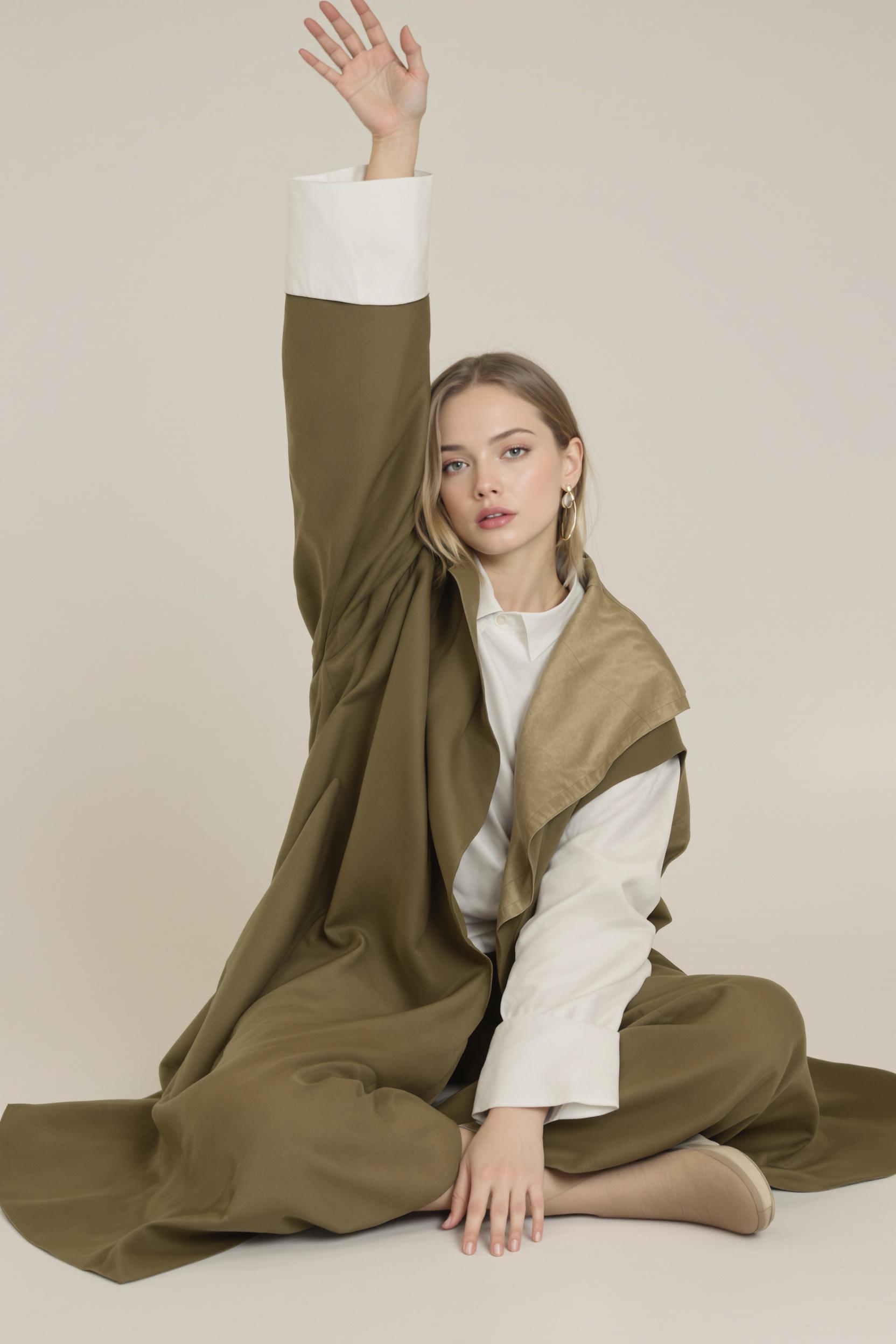 Женщина в лаконичном оливково-зелёном плаще свободного силуэта, под плащом белая сорочка с длинными широкими манжетами. Сидит на полу, ноги скрещены, одну руку вытягивает вверх, ладонь смотрит в объектив, взгляд сосредоточен в камеру, фон — светлый градиент.