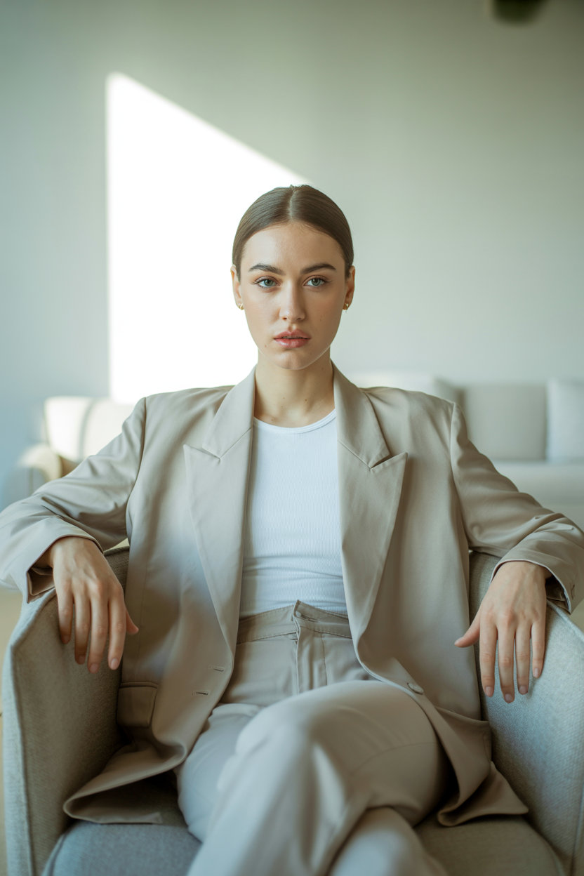 Женщина в лаконичном светло-бежевом пиджаке прямого кроя поверх тонкой белой хлопковой рубашки, узкие светлые брюки. Она сидит на светлом кресле, спина ровная, руки свободно лежат на подлокотниках. Естественный мягкий солнечный свет, солнечные блики на стене, минималистичная студия, натуральный макияж.