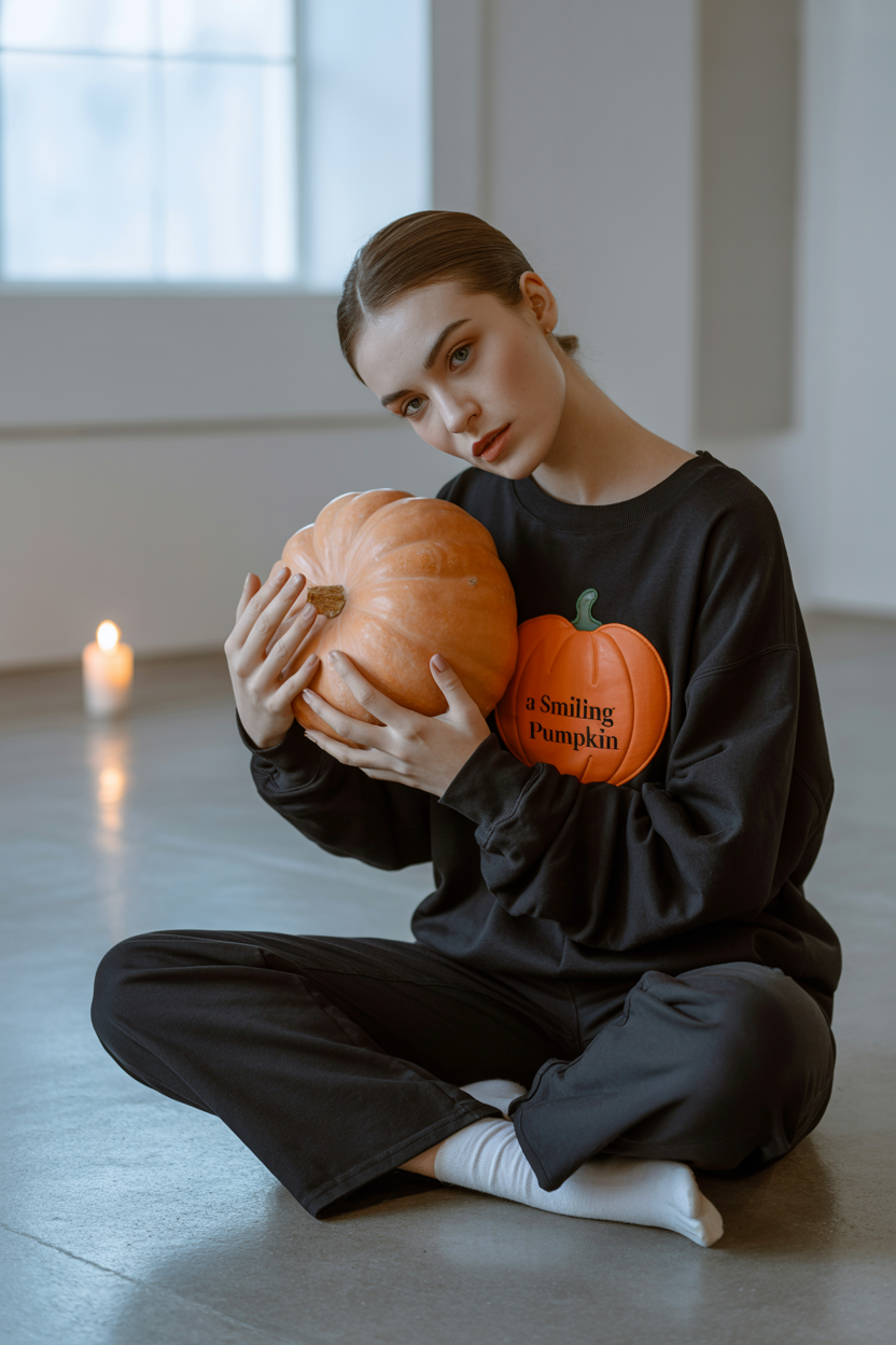 Примерить образ на себеЖенщина в лаконичном зале с белыми стенами, на ней свободный чёрный свитшот с яркой оранжевой аппликацией в виде улыбающейся тыквы, классические черные брюки, сидит на полу, обнимая большую декоративную тыкву, пристально смотрит в камеру, вокруг минимализм и свеча на фоне.