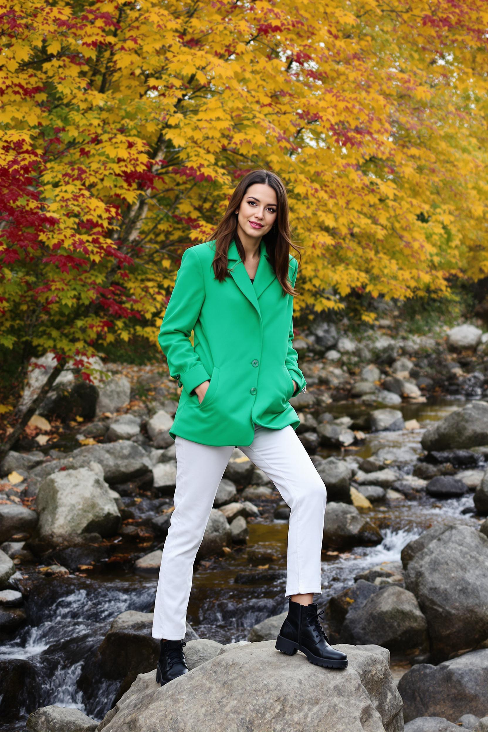 Женщина в лаконичной ярко-зелёной куртке и белых брюках стоит у небольшой реки, на фоне золотых и красных деревьев. Она одной ногой опирается о камень, руки в карманах, корпус слегка наклонён вперёд, уверенно и тепло смотрит в камеру.