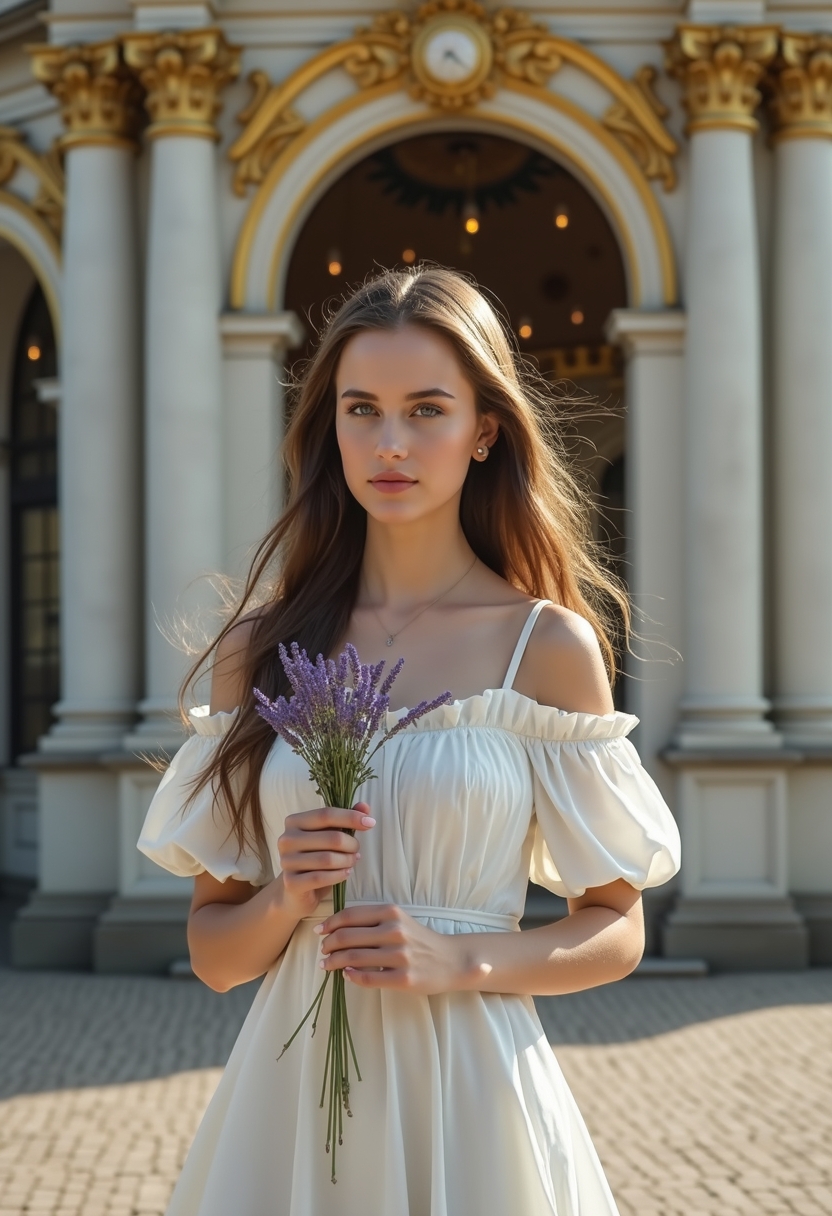 Женщина в лёгком белом платье стоит у арки Каррузель, её волосы слегка развеваются на ветру. В одной руке она держит небольшой букет лаванды, а в другой — книгу. Позади величественная арка с золотыми деталями и статуями. Крупный план, акцент на романтичности и исторической эстетике.