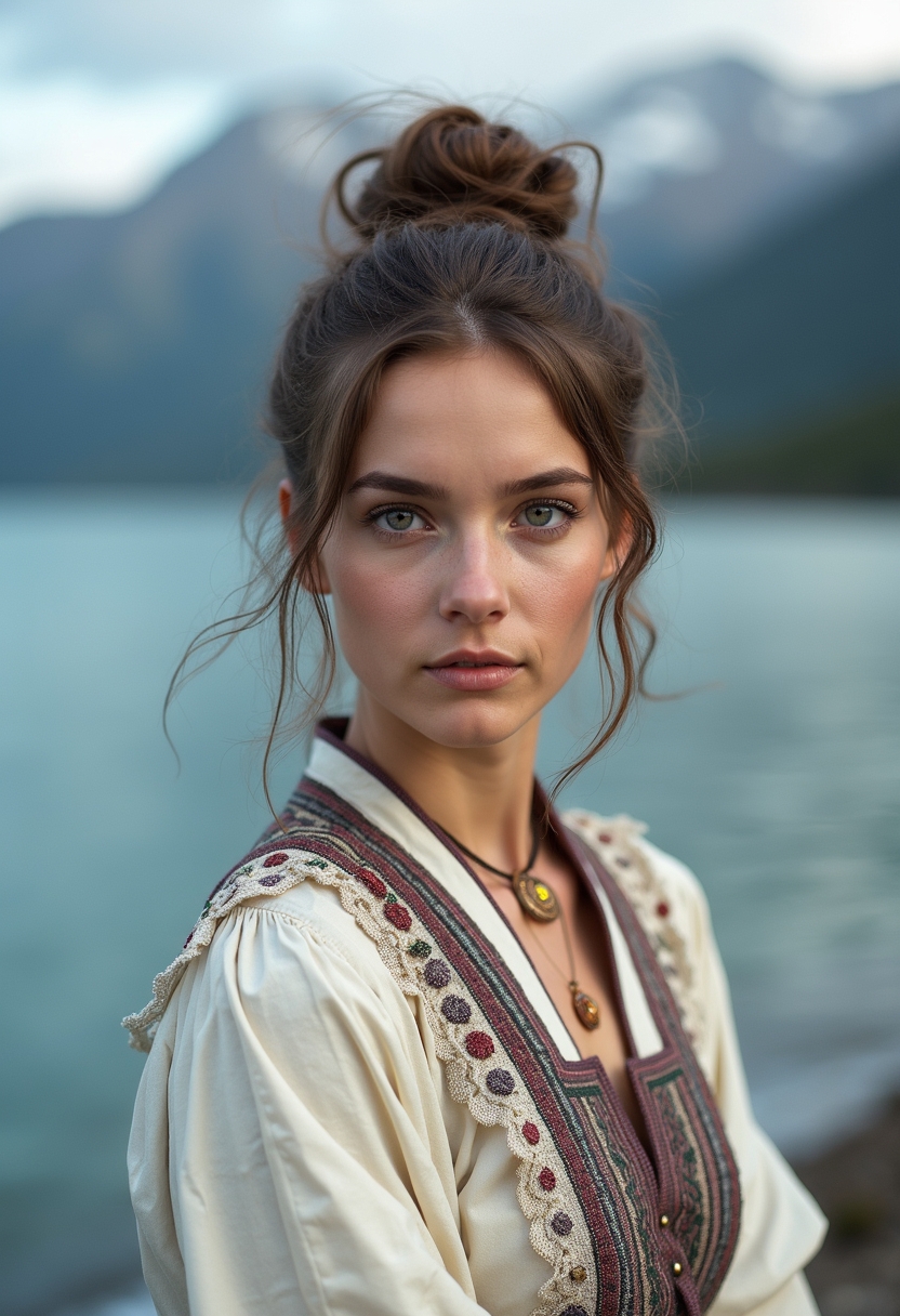 Женщина в лёгком бурятском костюме стоит на фоне озера Байкал и гор. Её волосы собраны в высокую причёску, лицо спокойно и уравновешенно. Крупный план, акцент на природной гармонии и глубине взгляда.