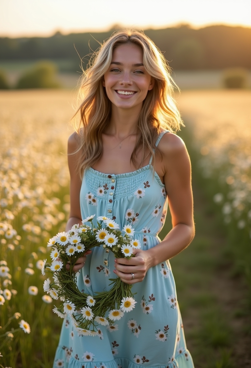 Женщина в лёгком голубом сарафане с цветочным принтом идёт босиком по лугу, держа в руках венок из ромашек. Её волосы рассыпались по плечам, а лицо светится от счастья. Позади поля в золотых оттенках, создающие эффект бескрайнего пространства. Крупный план, подчёркивающий естественность и гармонию с природой.