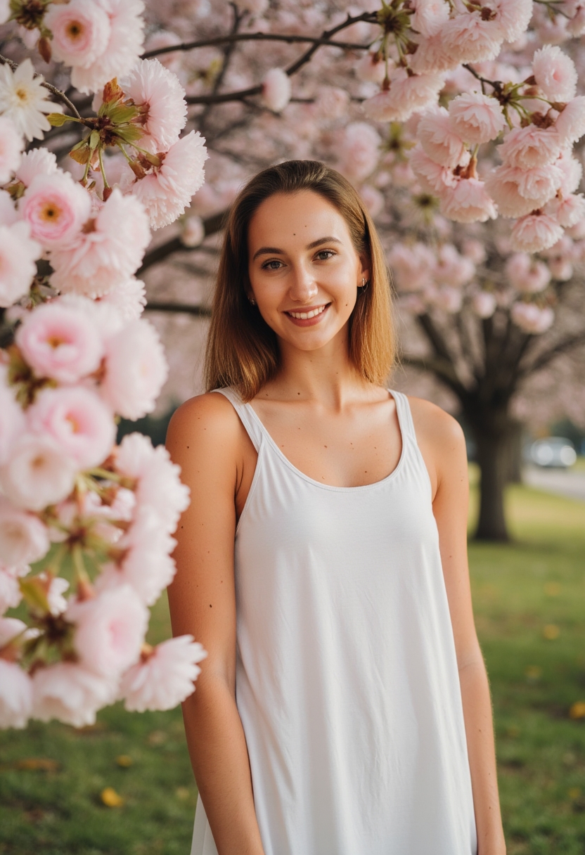 Женщина в лёгком хлопковом платье с открытыми плечами стоит у цветущей вишни, улыбаясь и смотря в камеру. Лёгкий ветер слегка развевает её волосы. Крупный план, создающий ощущение безмятежности и весеннего настроения.