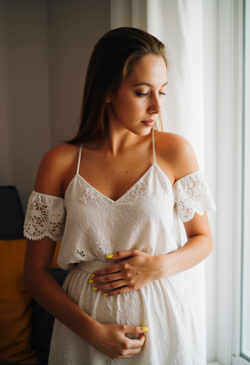 Женщина в лёгком кружевном платье стоит у окна, нежный свет падает на её лицо, она держит руки на животе