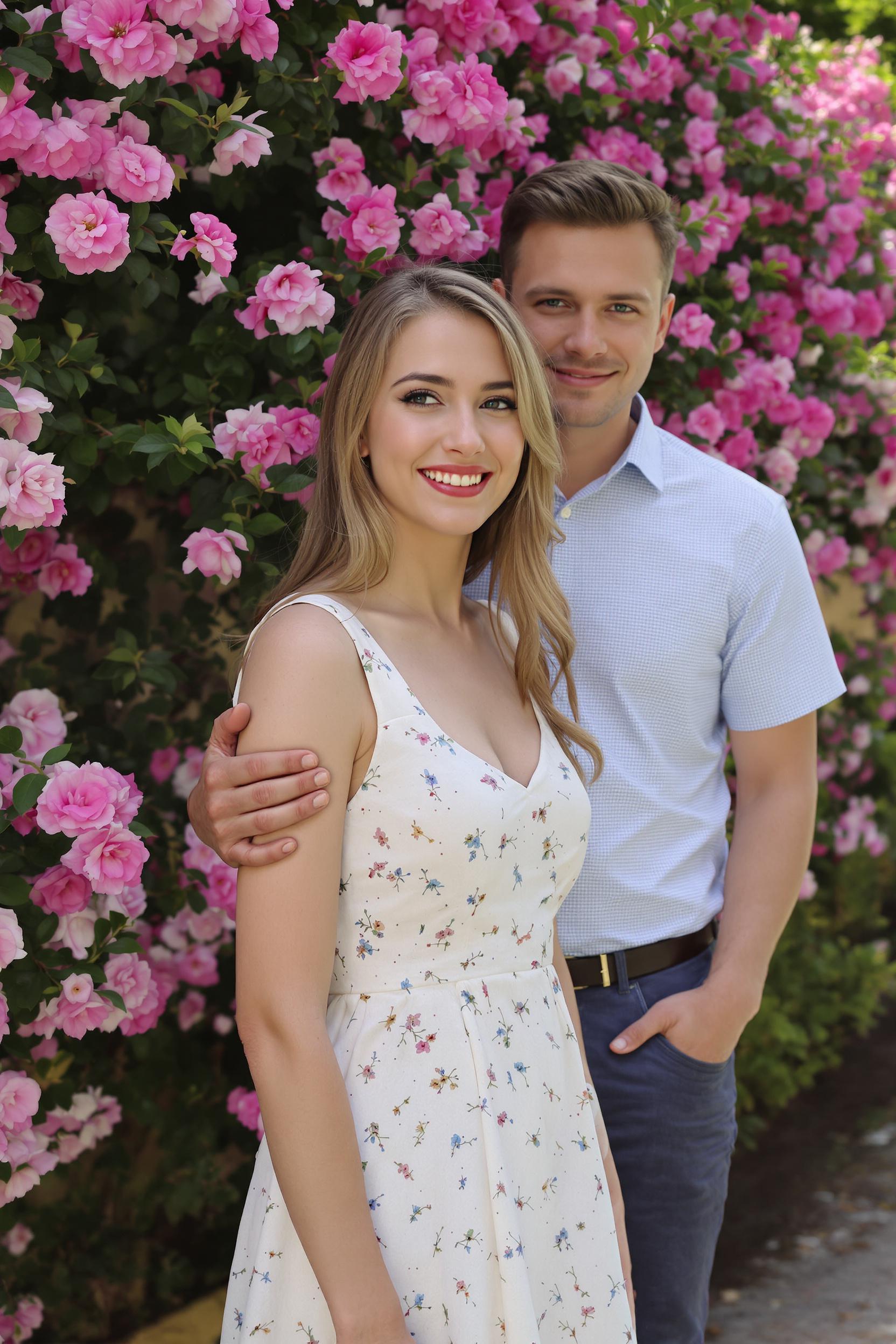 Женщина в лёгком летнем платье стоит у цветущей клумбы, её парень позади слегка касается её плеча, но в кадре акцент на ней — она смотрит в камеру с искренней улыбкой, свет и композиция подчеркивают её естественность и привлекательность.