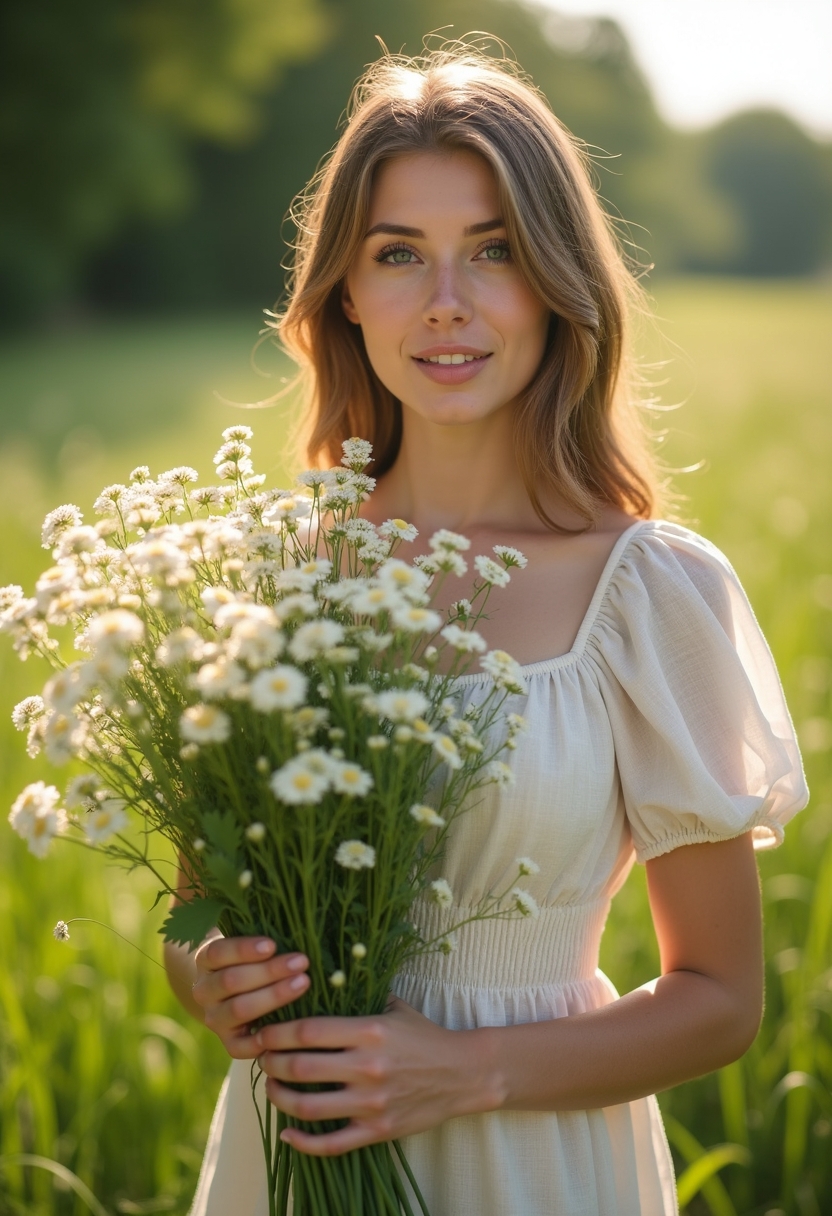 Женщина в лёгком льняном платье держит в руках большой букет полевых цветов, её пальцы слегка касаются лепестков. Позади зелёный луг, залитый солнечным светом. Крупный план, акцент на свежести и естественности сцены.