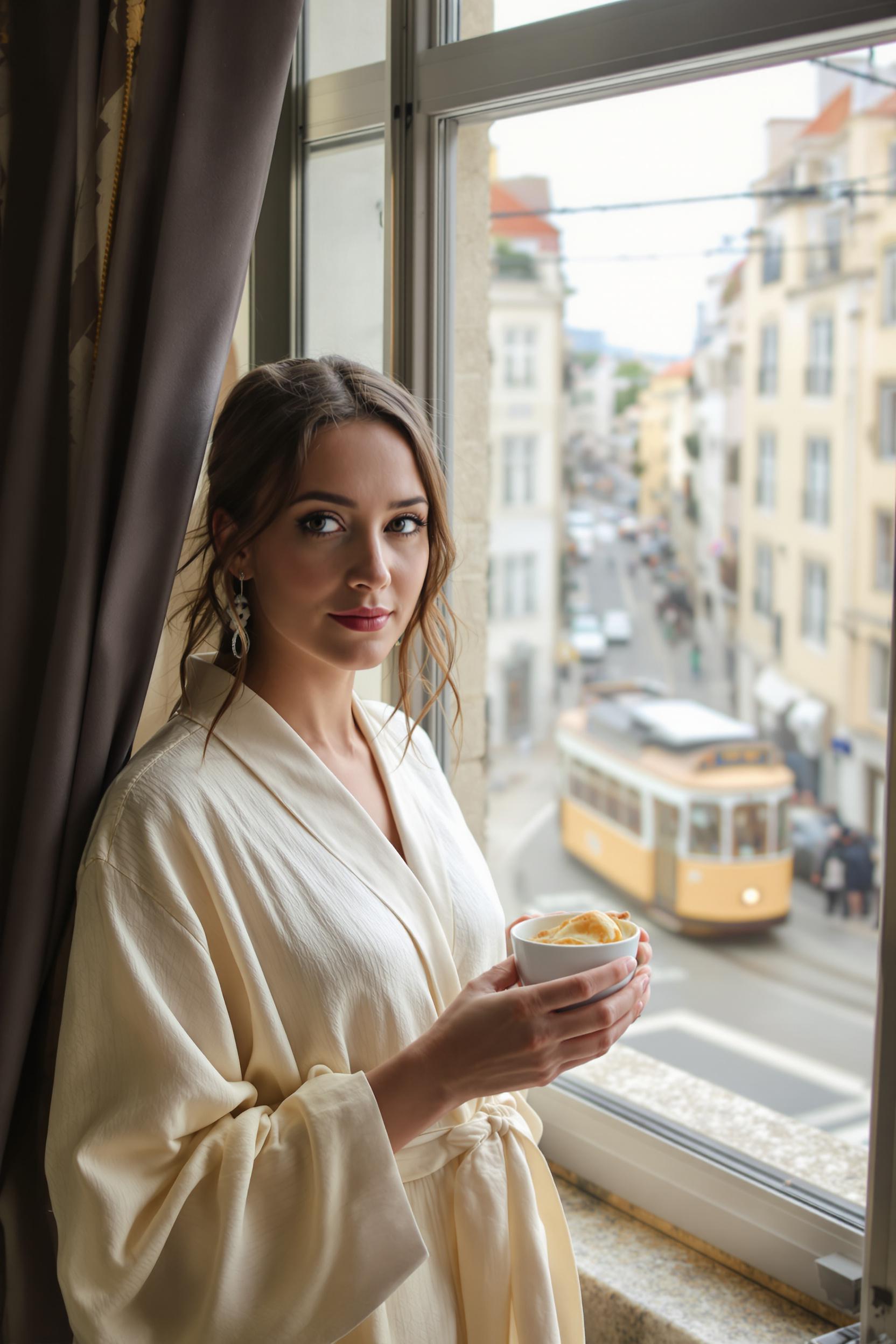 Молодая женщина в шелковом халате нежно-персикового цвета стоит у открытого окна с видом на уютные улочки Рима, в руках держит чашку кофе и багет. Она смотрит прямо в камеру, на лице лёгкий свежий макияж, утренний свет заливает комнату.