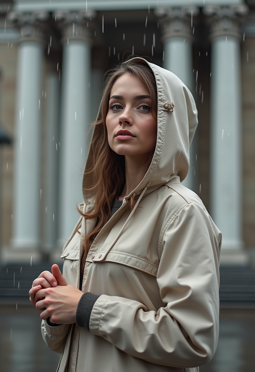Женщина в лёгком плаще с капюшоном стоит у Казанского собора, её руки сложены перед собой, а дождевые капли блестят на ткани. Она смотрит в камеру с задумчивостью, позади колоннада собора. Крупный план, подчёркивающий величие архитектуры и драматичность момента.