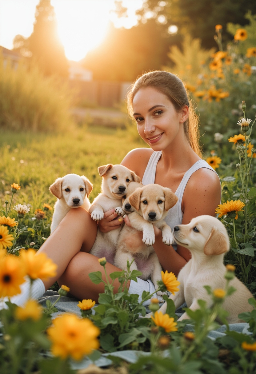 Женщина в лёгком платье держит в руках нескольких щенков, окружённых цветами и зеленью. Фон — яркое солнце и летнее небо.