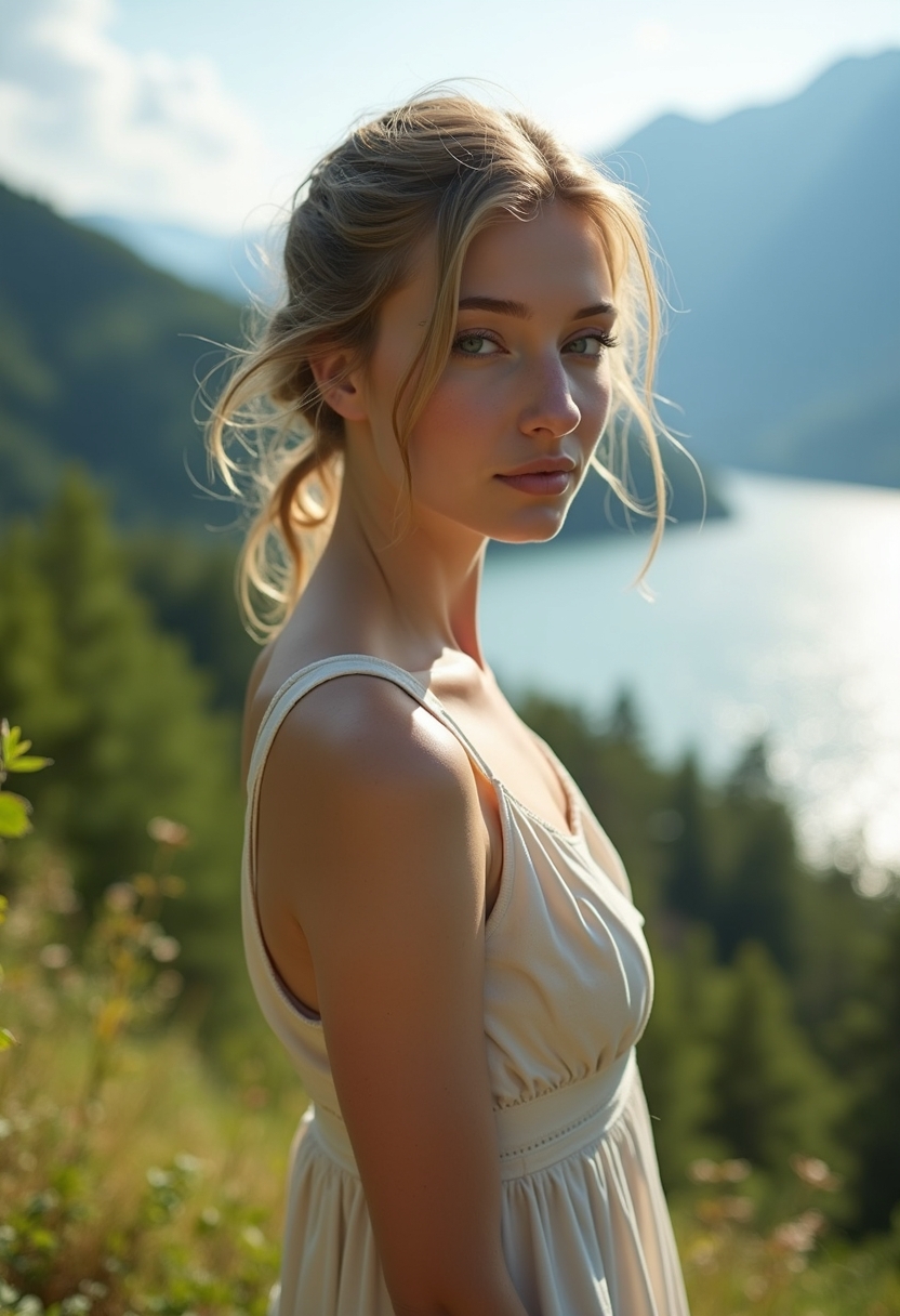 Женщина с распущенными волосами, слегка прищурившись, смотрит в камеру. На ней струящееся голубое платье, а позади размытая водная гладь горного озера. Ближний план, акцент на выражении глаз и лёгкости ткани.