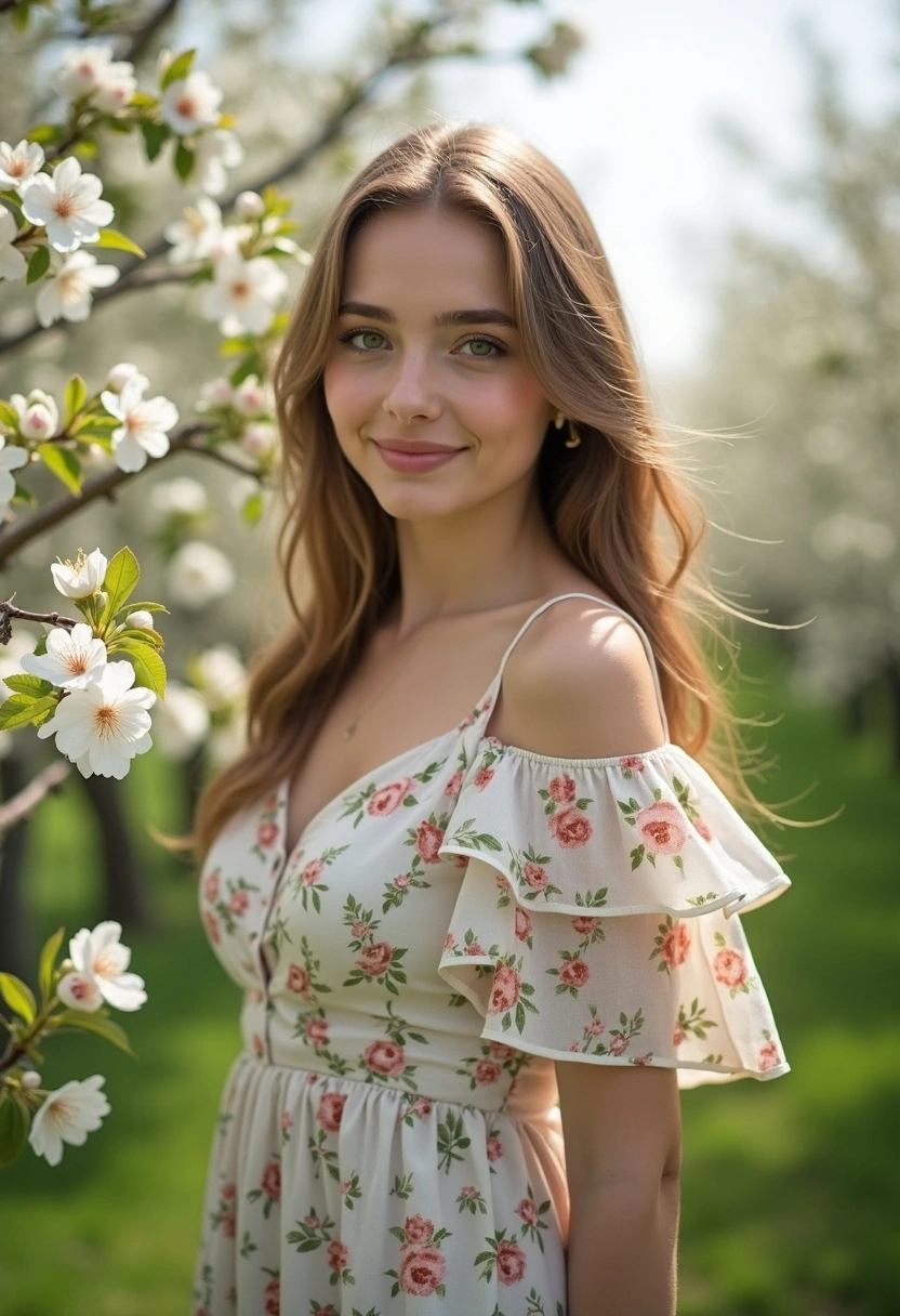 Женщина в лёгком платье с цветочным принтом стоит среди цветущих яблонь. Она улыбается и смотрит в камеру, её волосы мягко развеваются на весеннем ветру. Крупный план, акцент на естественности и свежести образа.
