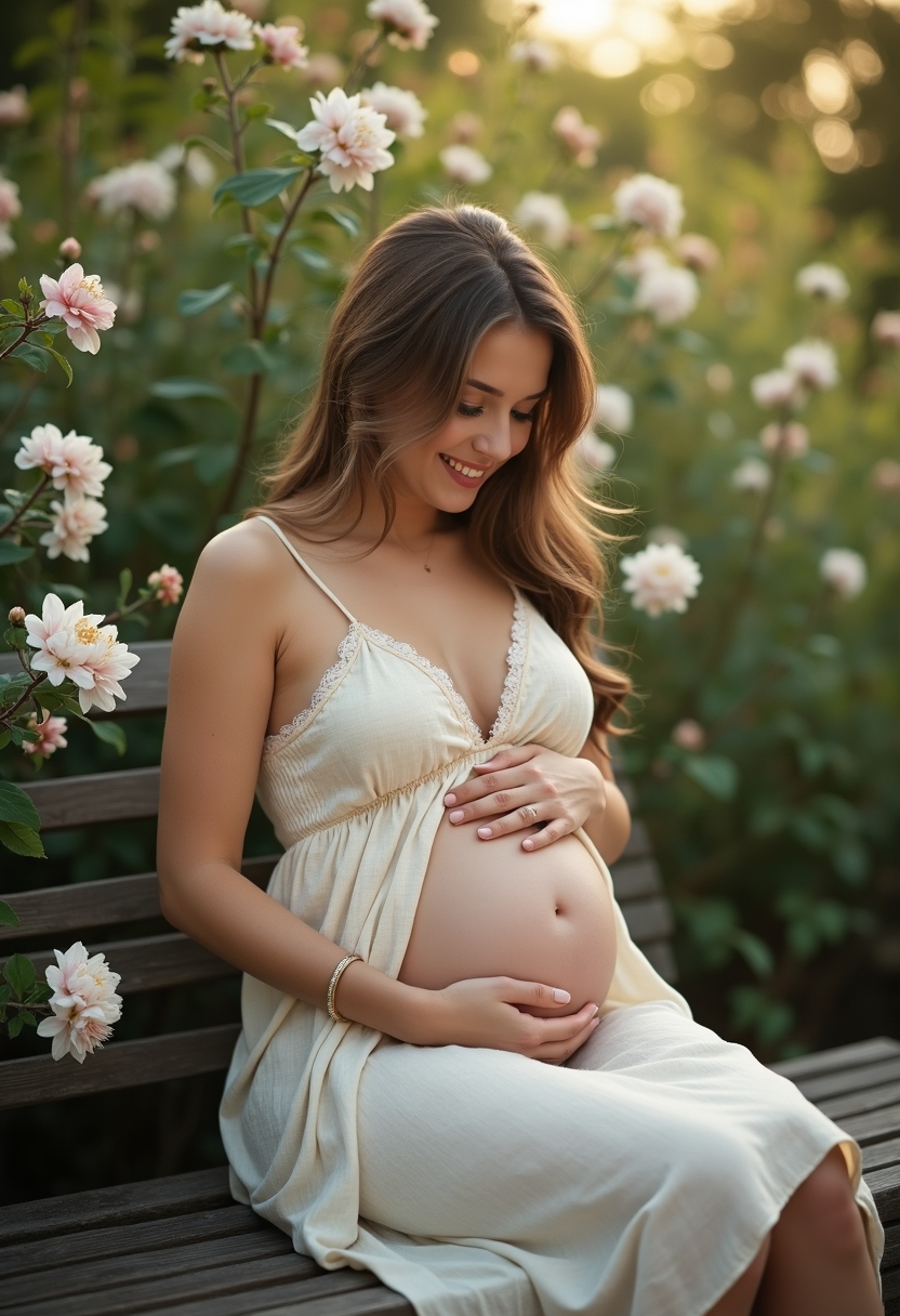 Женщина в лёгком сарафане сидит на деревянной скамейке в саду, вокруг цветущие кусты, она смотрит на живот с улыбкой