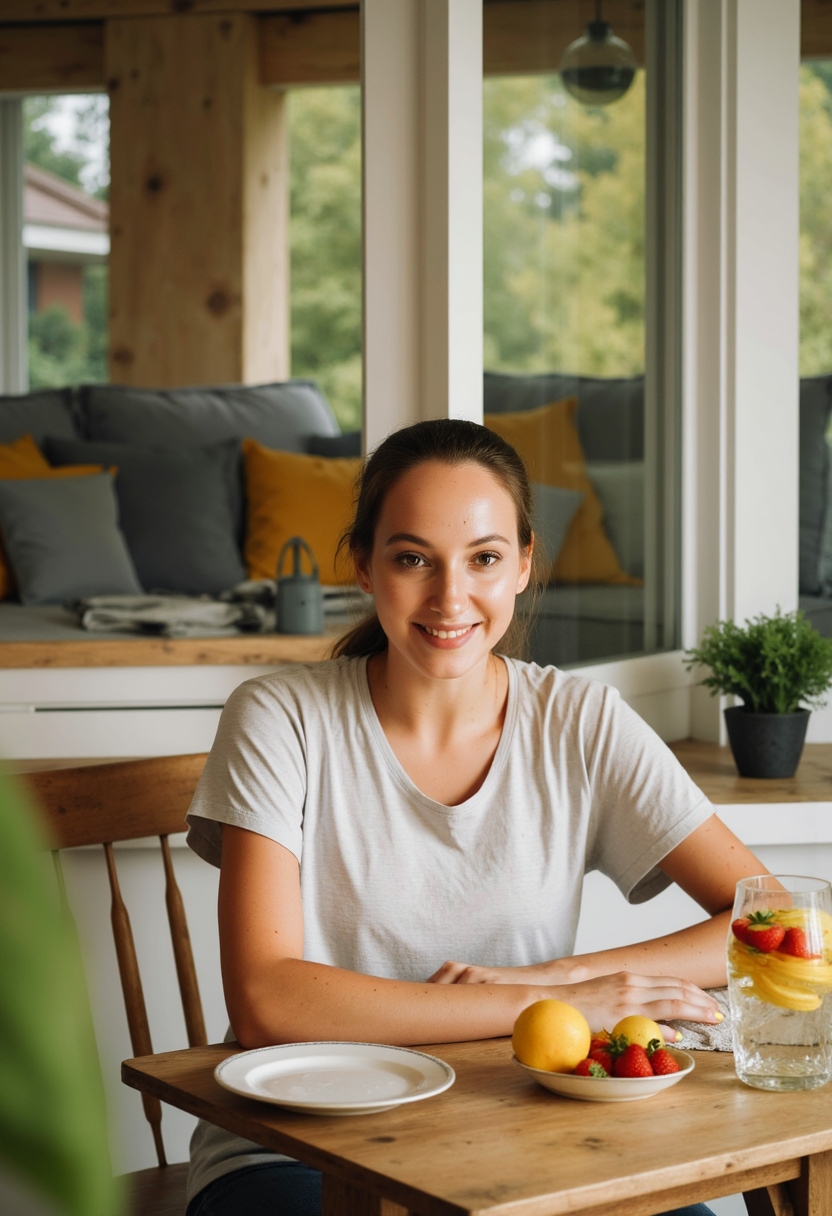 Женщина в лёгкой блузке сидит за деревянным столом на даче, перед ней стакан с лимонадом и тарелка с клубникой. Она весело смотрит в камеру, на фоне — майская зелень и гирлянды. Крупный план, акцент на уюте и тёплой атмосфере.