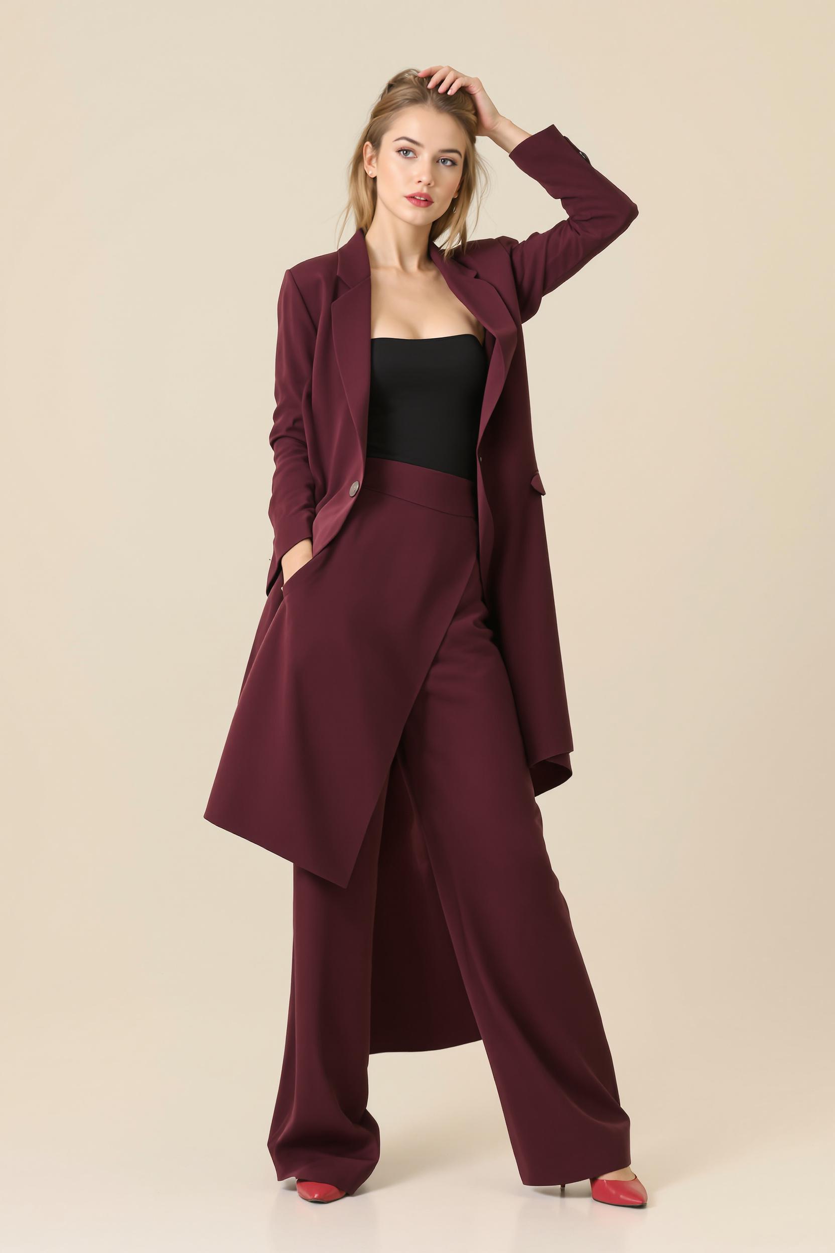 Женщина в минималистичном костюме глубокого баклажанового оттенка, длинный жакет асимметричного кроя на одной пуговице, под ним — лаконичная черная майка. Стоит, положив одну руку на голову, вторая согнута у талии, взгляд в камеру, фон светлый.