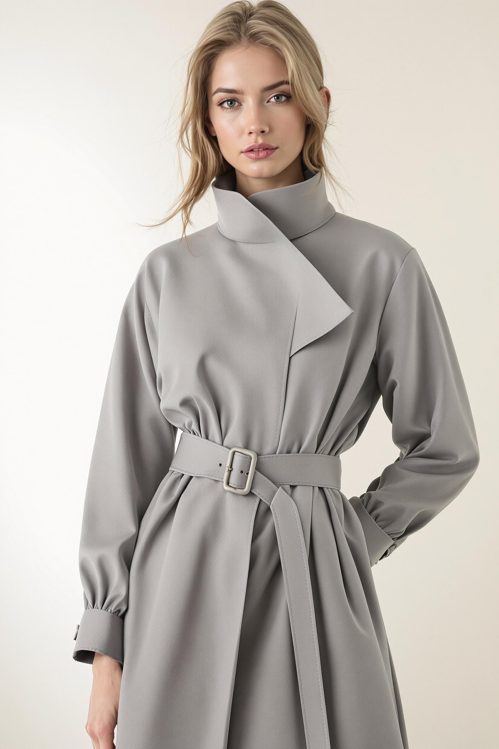 Женщина в минималистичном сером платье-плаще с объемным воротником-стойкой, пояс акцентирует талию, рукава приспущены, одна рука вытянута вперед ладонью к камере, другая — за спиной. Взгляд прямо в объектив, фон — мягкий молочный градиент.