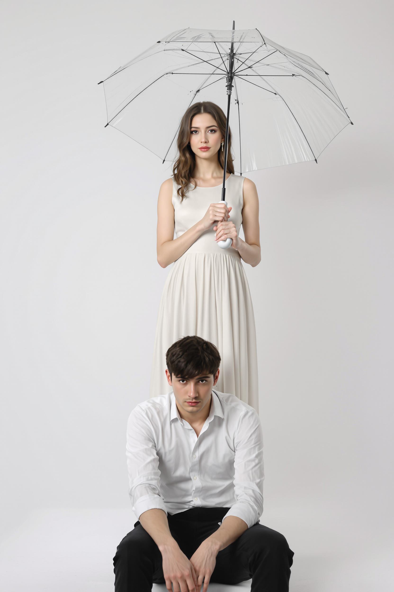Женщина в минималистичном светлом платье стоит на циклораме, держит прозрачный зонт. Парень сидит у её ног, его лицо скрыто за коленями. Она смотрит прямо в камеру, акцент на плавности её позы и чистоте белого пространства.