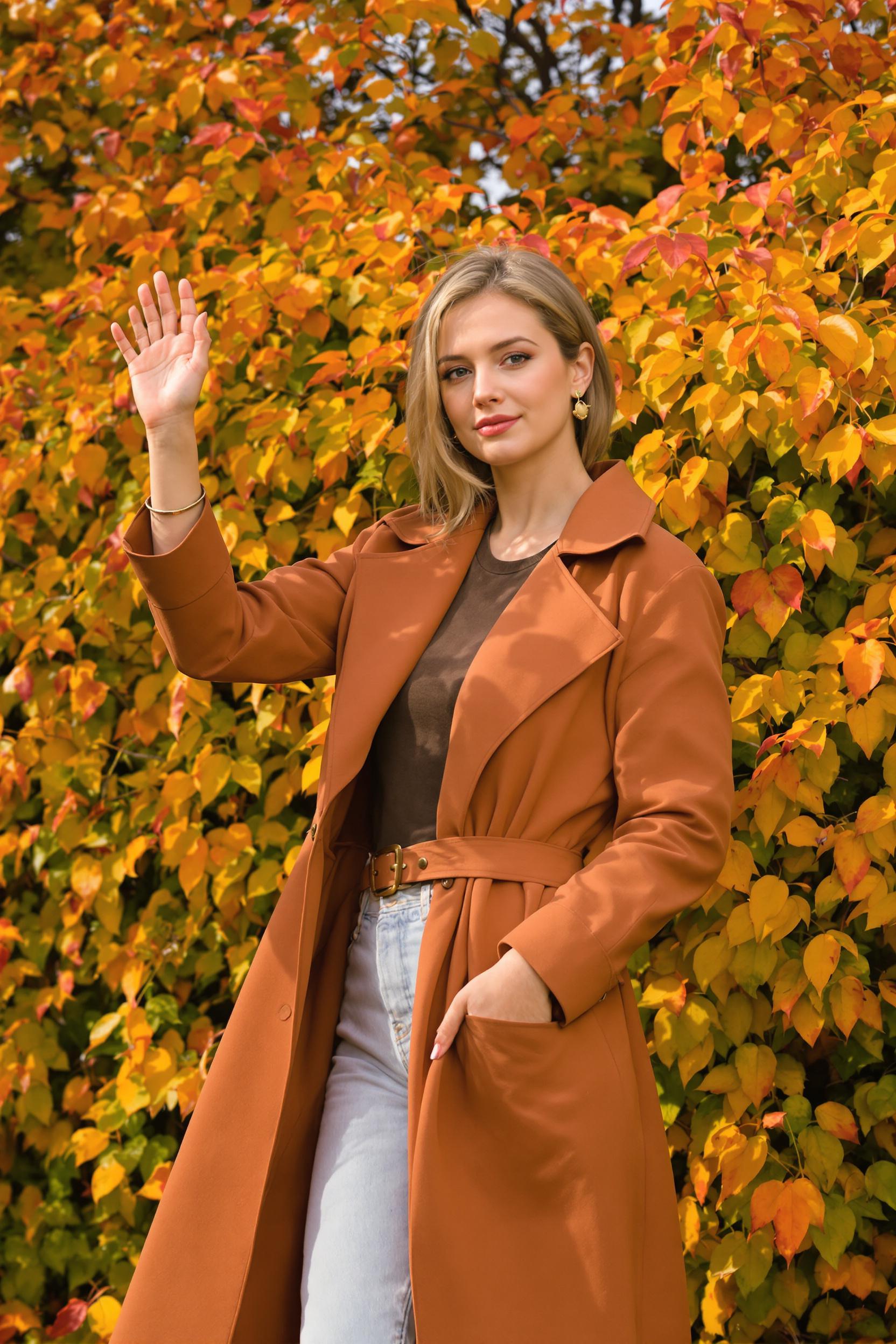 Женщина в минималистичном терракотовом тренче и светлых джинсах стоит среди осенних кустарников, подняв одну руку вверх, словно ловя солнечные лучи. Вторая рука на поясе, свободная поза, уверенный взгляд прямо в камеру, вокруг яркая листва.