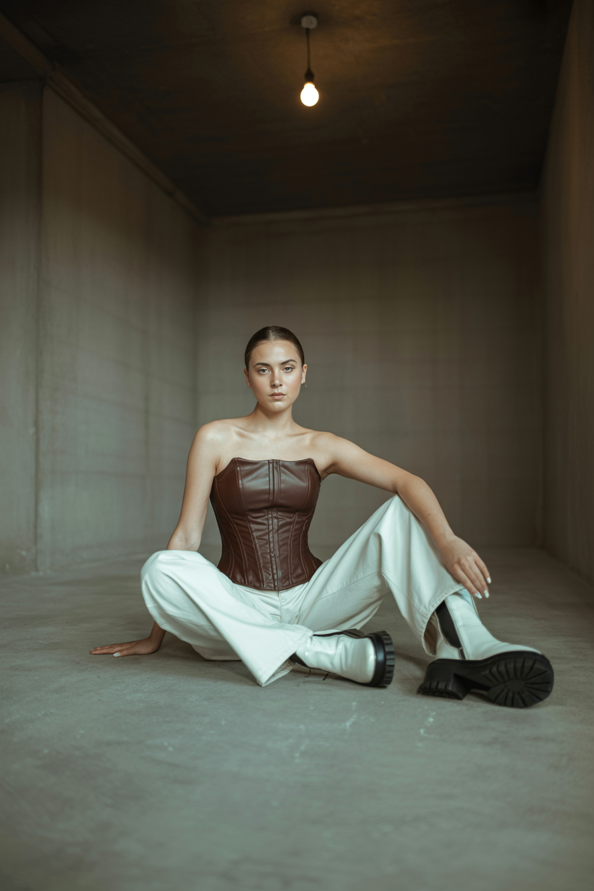 Женщина в минималистичной фотостудии с бетонными стенами, одета в шоколадный кожаный корсет, свободные белые хлопковые брюки и массивные сапоги. Она сидит прямо на полу, одну ногу согнув, а вторую вытянув вперёд, локтем опёршись на колено, пристально смотрит в камеру, вокруг холодный свет и тень.