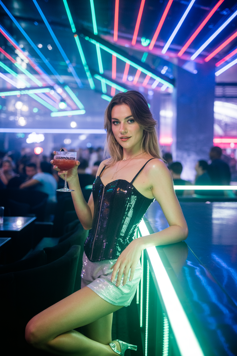 Женщина в модном клубе, одета в черный корсет с пайетками и короткие серебристые шорты, на ногах прозрачные туфли на высоком каблуке, стоит у ярко подсвеченного подиума, одной рукой держит коктейль, другой опирается на перила, свободно позирует и смотрит прямо в камеру. Вокруг разноцветные огни, атмосфера веселья.