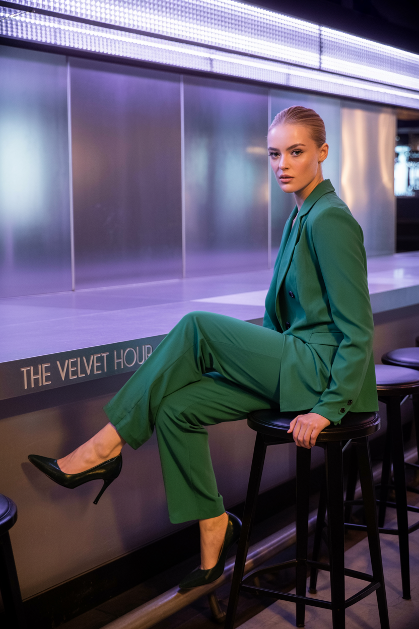 Женщина в модном клубе, одета в изумрудный брючный костюм с длинным рукавом и черные туфли на каблуке, сидит на высоком барном стуле, положив одну ногу на подставку, и смотрит прямо в камеру. Вокруг переливы фиолетового света, отражения на зеркальных стенах, атмосфера стиля и загадки.