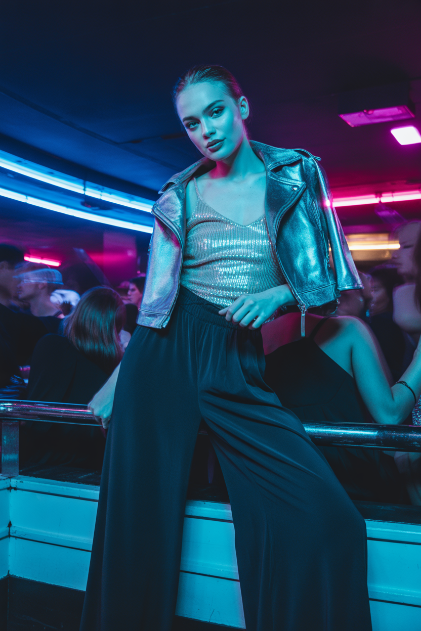 Женщина в модном клубе, одета в серебристый топ с пайетками и высокие черные брюки-палаццо, на плечах короткая кожаная куртка, стоит в центре танцпола, слегка склонила голову вбок и смотрит прямо в камеру. Вокруг мерцают неоновые огни, ощущение ритма и энергии ночи.