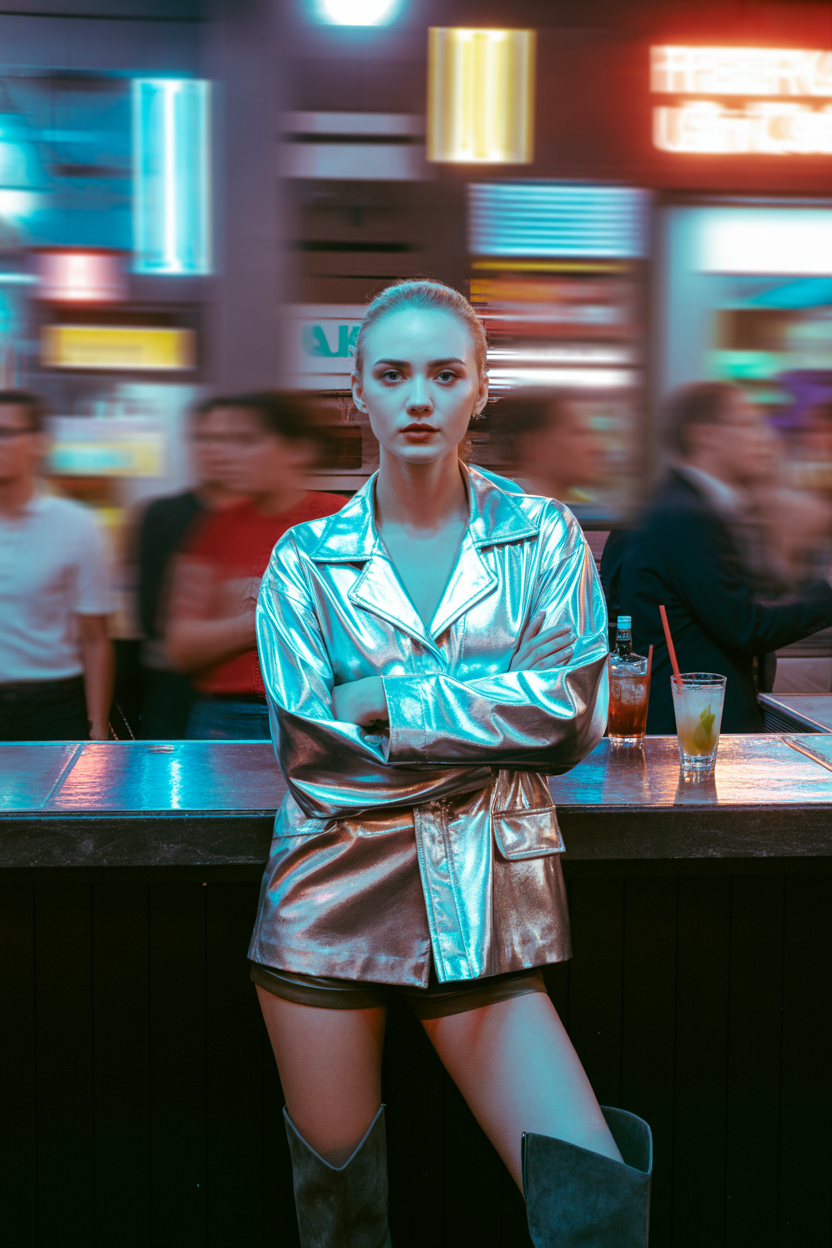 Женщина в модном ночном клубе, одета в серебристый жакет оверсайз с блестящей фактурой и короткие черные шорты, на ногах высокие замшевые сапоги. Стоит у неоновой стойки, скрестив руки на груди, и уверенно смотрит прямо в камеру. Вокруг яркие огни и динамичные отблески, ощущение свободы.