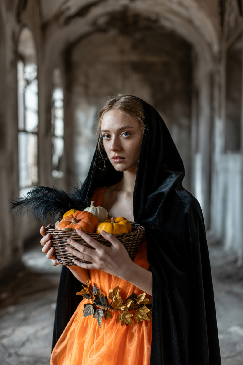 Женщина в мрачной заброшенной часовне, на ней светящееся платье из оранжевой органзы, чёрная бархатная мантия с капюшоном и пояс из искусственных золотых листьев, в руках корзинка с мини-тыквами и чёрными перьями, она стоит полубоком, нежно прижимая корзину к себе, и выразительно смотрит в камеру, повсюду разлито мягкое световое пятно.