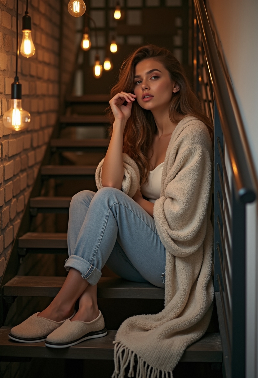 Женщина в мягком пледе и домашних тапочках сидит на лестнице в лофте, вокруг старинные кирпичные стены и индустриальные лампы, она смотрит прямо в камеру