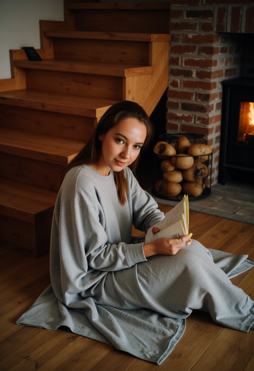 Женщина в мягком пледе сидит у деревянной лестницы на фоне кирпичной стены, в руках книга, рядом тлеющий камин, она смотрит прямо в камеру
