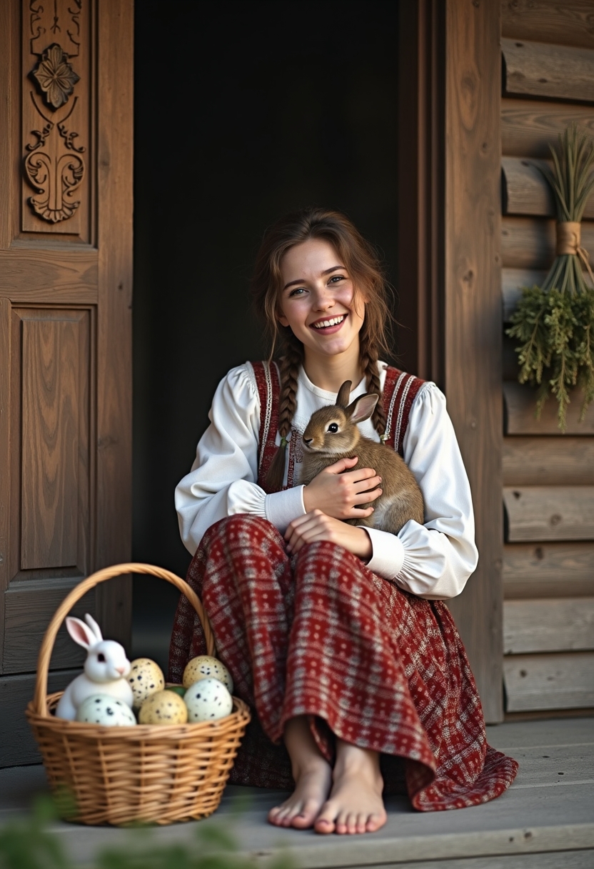 Женщина в народной одежде сидит на крыльце избы, её ноги босые, а рядом стоит корзинка с крашеными яйцами. Она держит одного из кроликов на руках и смеётся, глядя в камеру. Позади деревянные ставни с резьбой и висящие пучки сушёных трав. Крупный план, создающий уютную деревенскую картину.