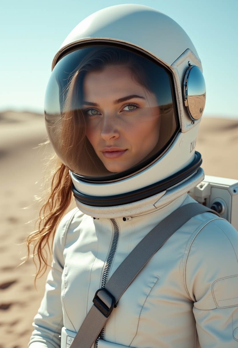 Женщина стоит на фоне стилизованной поверхности Луны, в серебристом облегающем комбинезоне и зеркальном шлеме в руках. Она смотрит прямо в камеру, а позади звёздное небо с орбитальными линиями. Крупный план, акцент на уверенности и футуристике.