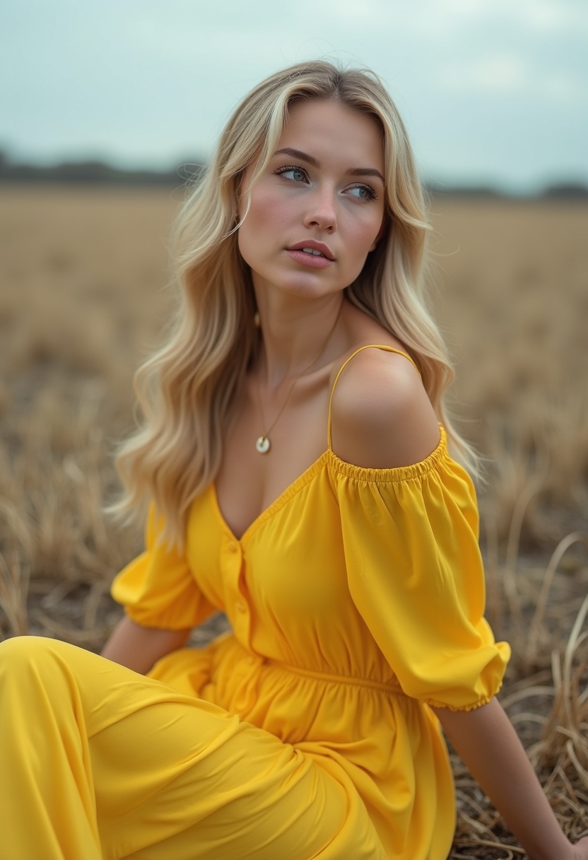 Женщина в насыщенно-жёлтом платье простого кроя сидит в пустом поле, смотря вдаль. Окружающее пространство пустое и без деталей, серо-бежевые оттенки земли усиливают эффект контраста и яркости её наряда. Крупный план.