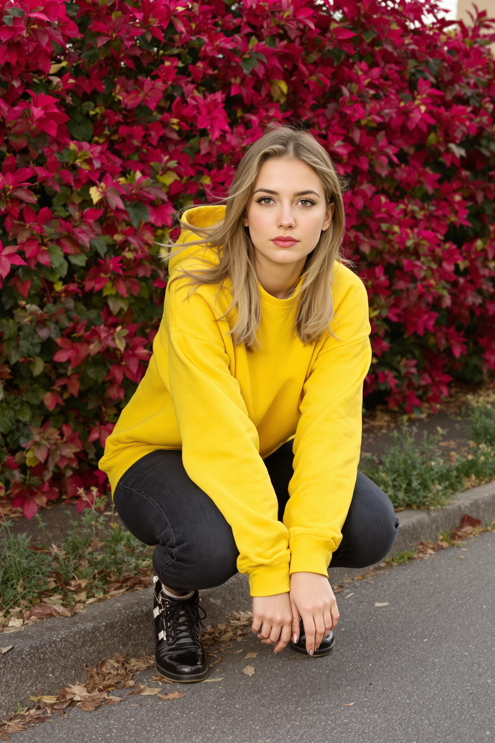 Женщина в насыщенном жёлтом минималистичном свитшоте и чёрных джинсах присела на корточки у края дорожки, на фоне багряных кустов, локти обнимают колени, взгляд искренний прямо в камеру.